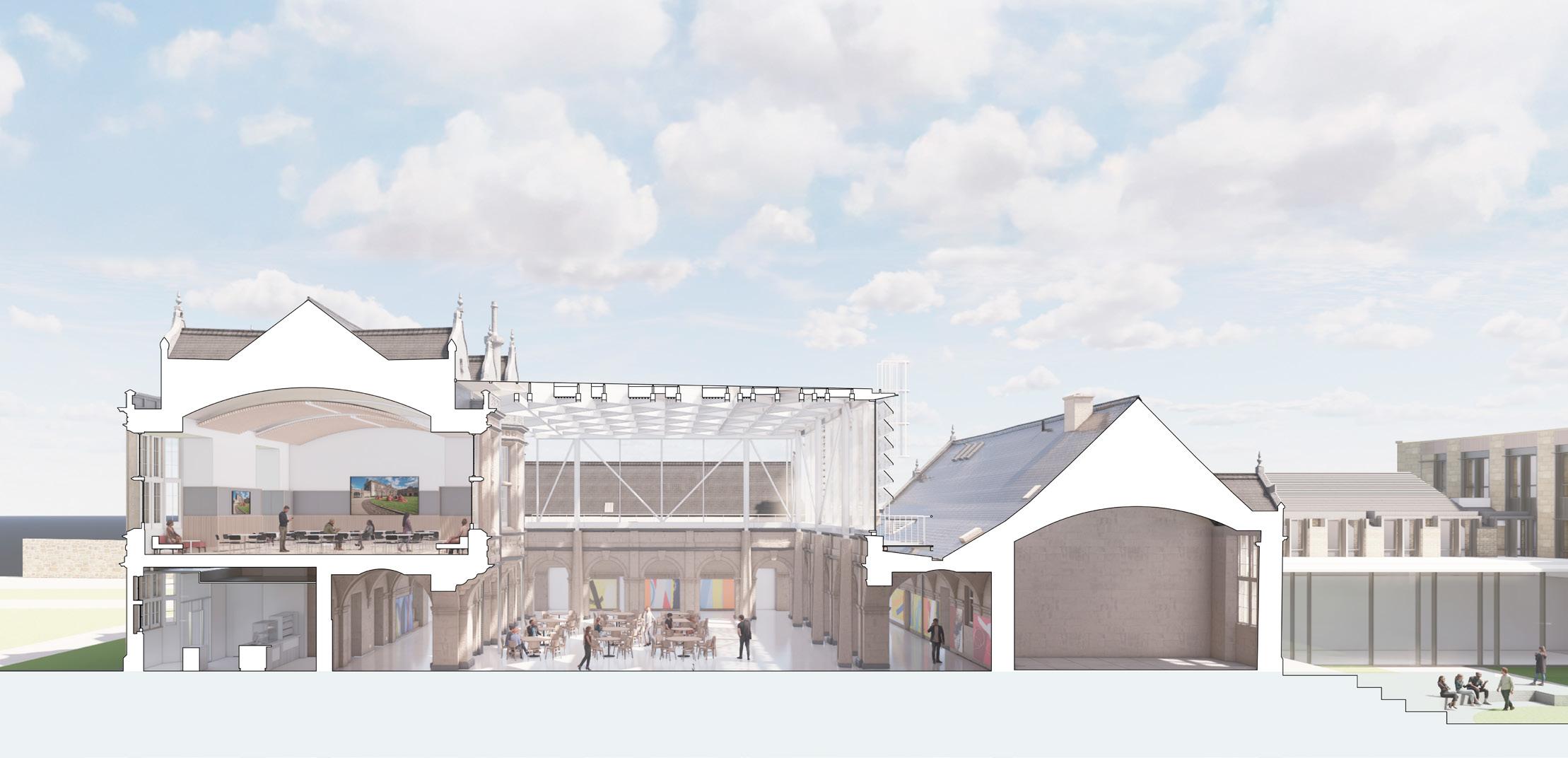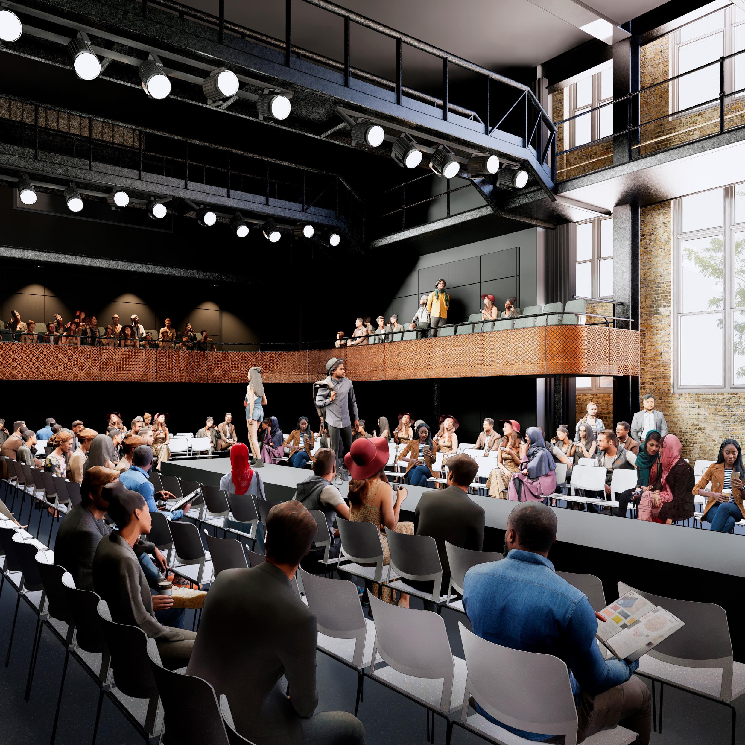 A new performing arts centre will include a 200-seat theatre located behind the retained façade of a Grade II listed former chapel. A 60-seat studio theatre space will also be provided along with rehearsal and back of house spaces.