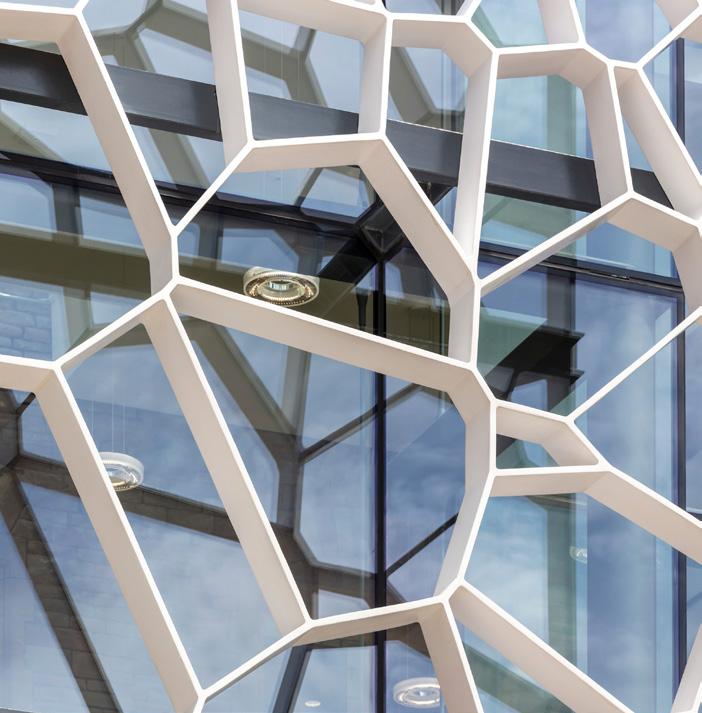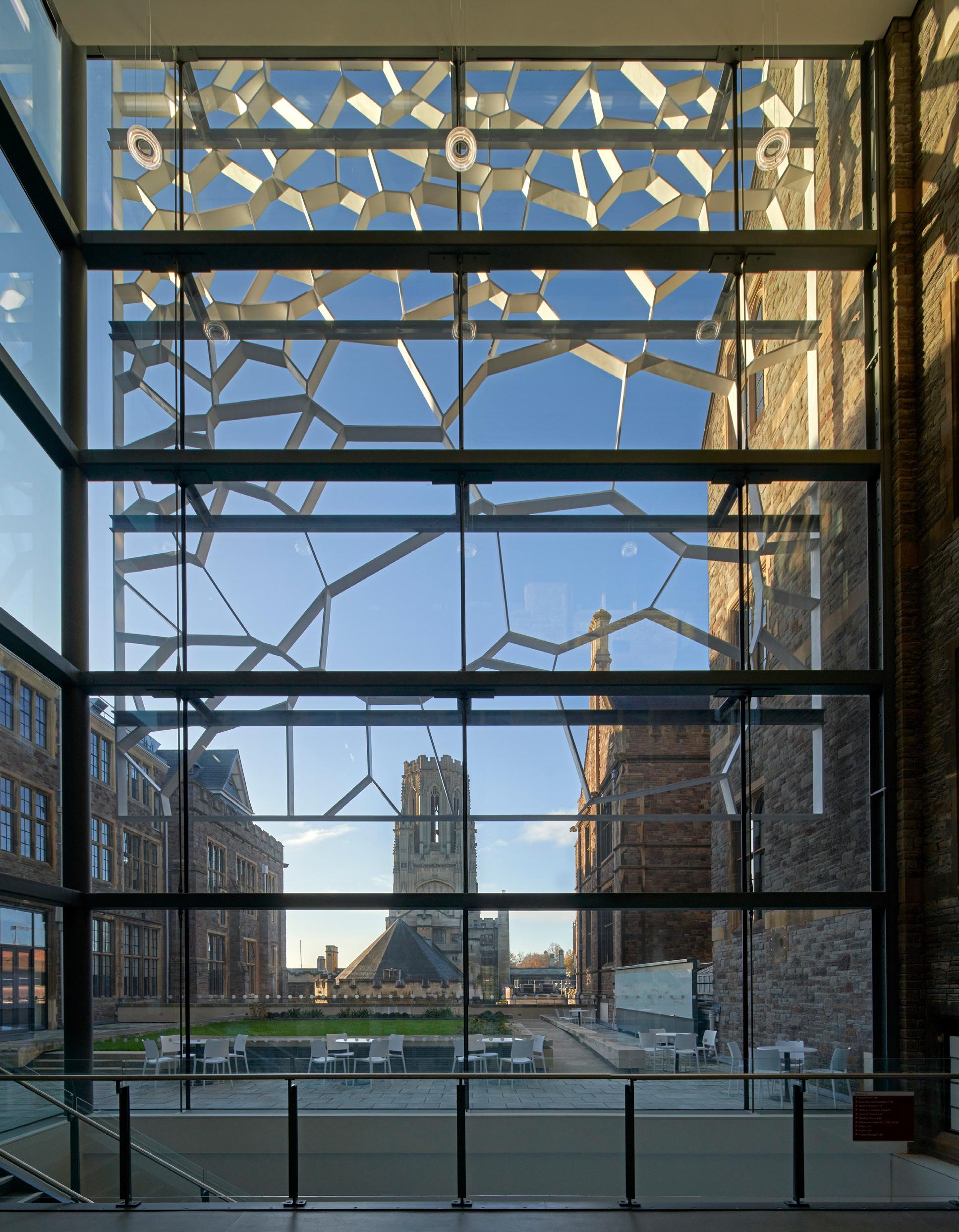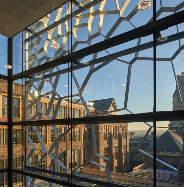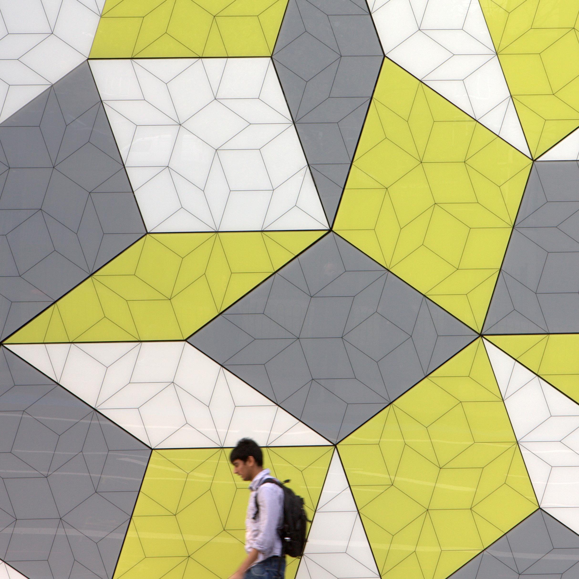 For the School of Mathematical Sciences, a new foyer and social/study space has helped establish a strongly identifiable entrance to the campus, clad with glass rainscreen panels, the form of which has been generated by a Penrose tiling pattern.