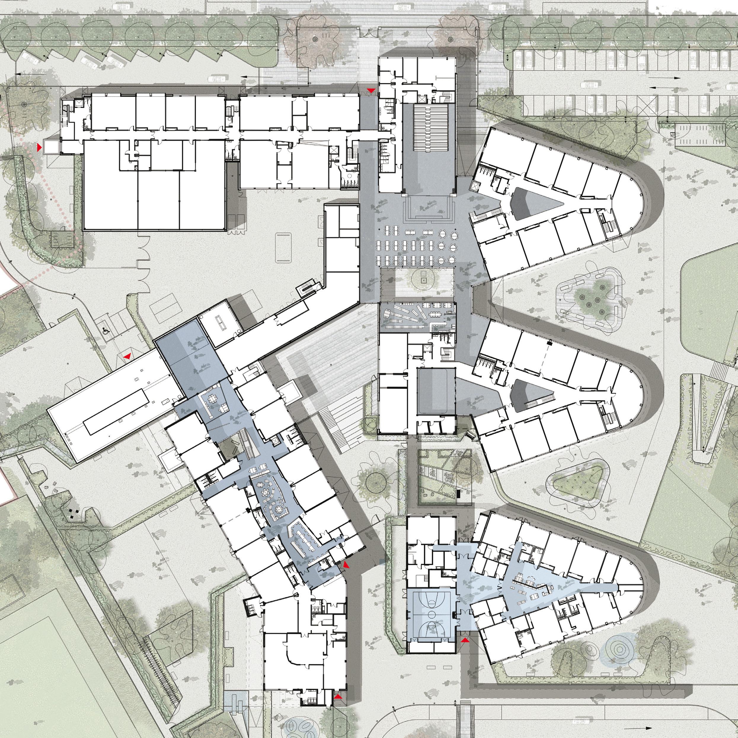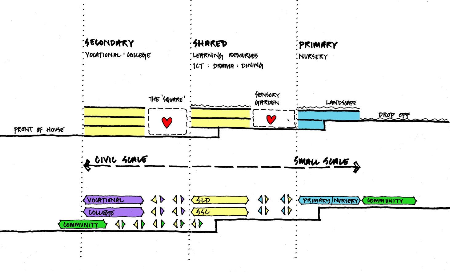 With central catering and administration serving the site from the heart of the campus, each ‘school’ maintains its identity within the larger whole. Spaces for primary and SLD children are self-contained but benefit from close proximity to the central learning resource centre and music facilities.