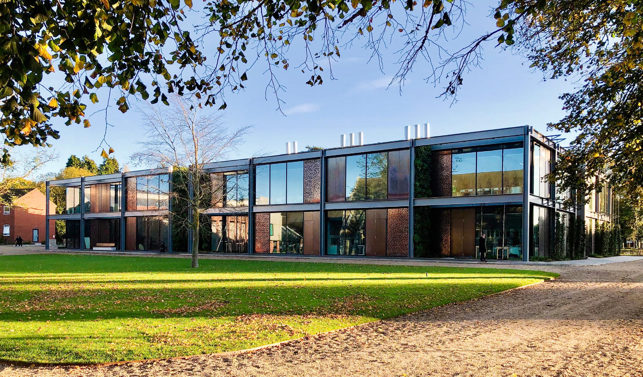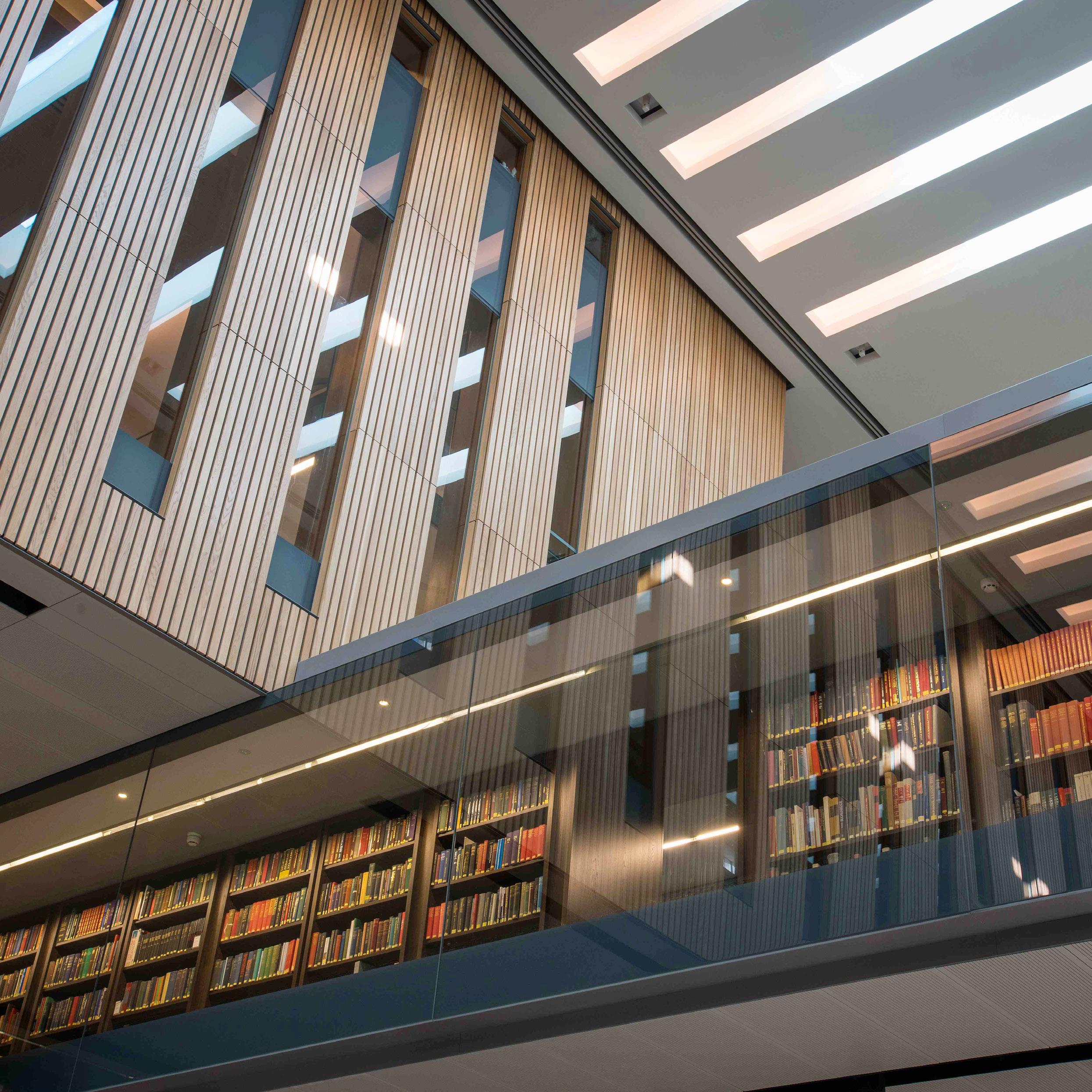 This humanities building accommodates the entire History Department and includes a timber-clad 300-seat auditorium and foyer, centrally-bookable seminar rooms and a top floor senior common room. A 60-seat film and drama studio, licensed for public performances, projects over the pavement and is clad in glass panels with a digitally printed artwork by the artist Jacqueline Poncelet.