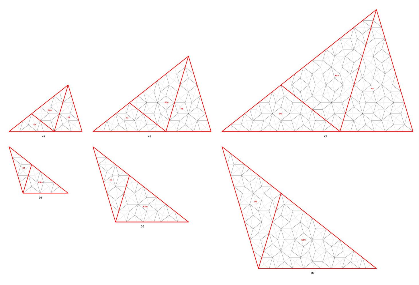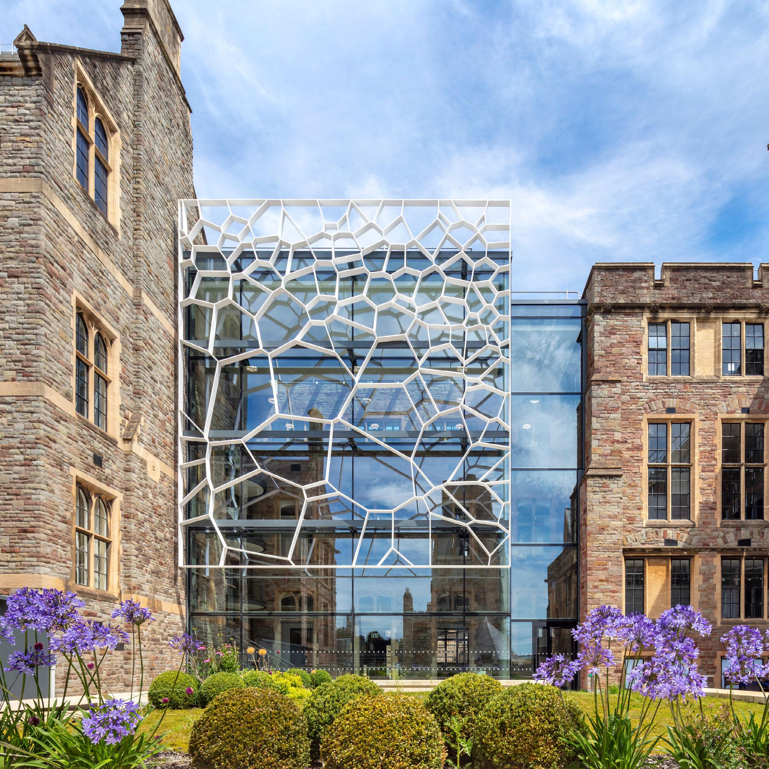The extension is a single storey structure clad with glass rainscreen panels, the form of which has been generated by a Penrose tiling pattern – a narrative response to the academic school, where Sir Roger Penrose is a visiting professor. As well as informing the geometry of the form, a smaller scale subset of Penrose tiling is applied to each glass panel as a graphic pattern.