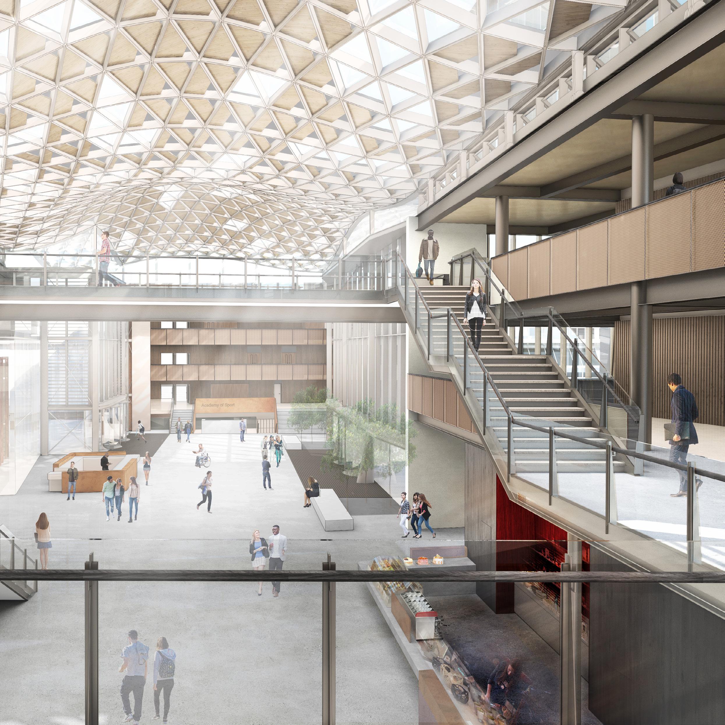 The different parts of the wider scheme are connected by a lightweight, undulating roof structure that encloses a large internal concourse to create a new focal point and gateway to the University. A series of new external spaces are also created around the buildings to provide much-needed external amenity space for the University’s very urban campus.