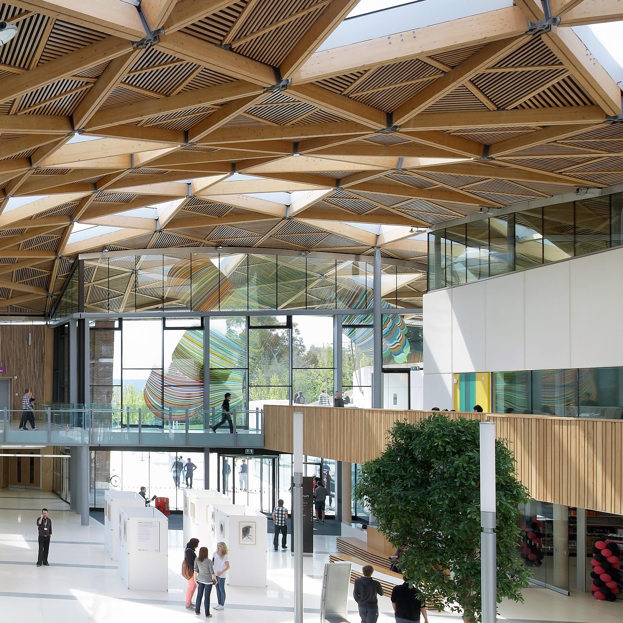 The undulating timber gridshell roof shelters and unifies a series of new student-focused spaces within while also relating to the natural contours of the wider site.