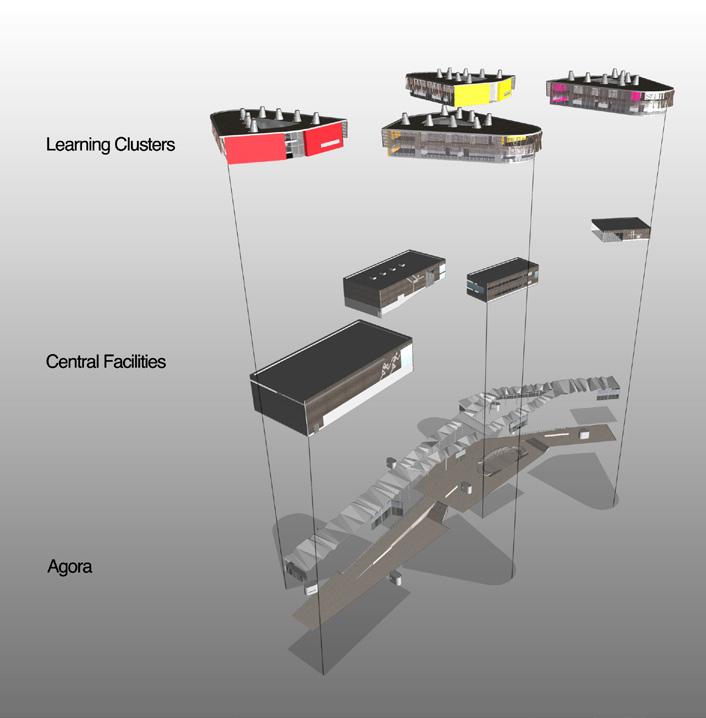 WilkinsonEyre, together with educational consultant Graham Parker, was selected by the DfES in 2003 to develop an exemplary secondary school design. The objective of the exemplar design exercise was to offer an architecture that supported innovative learning and teaching methods as well as providing a stimulating and fun built environment, adopting best practice from schools and other building types. The team took a kit of parts approach, developing a series of components that could be applied to a variety of different sites and scenarios. The basic building block is a two-storey ‘learning cluster’, each housing up to 300 students and arranged around a central agora, inspired by the ancient Greek marketplace.