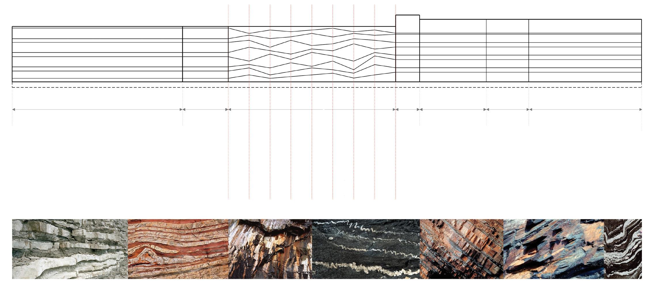 The skin is composed of accentuated horizontal bands and striated with four different degrees of translucency, allowing for digital messaging to be projected along its length.