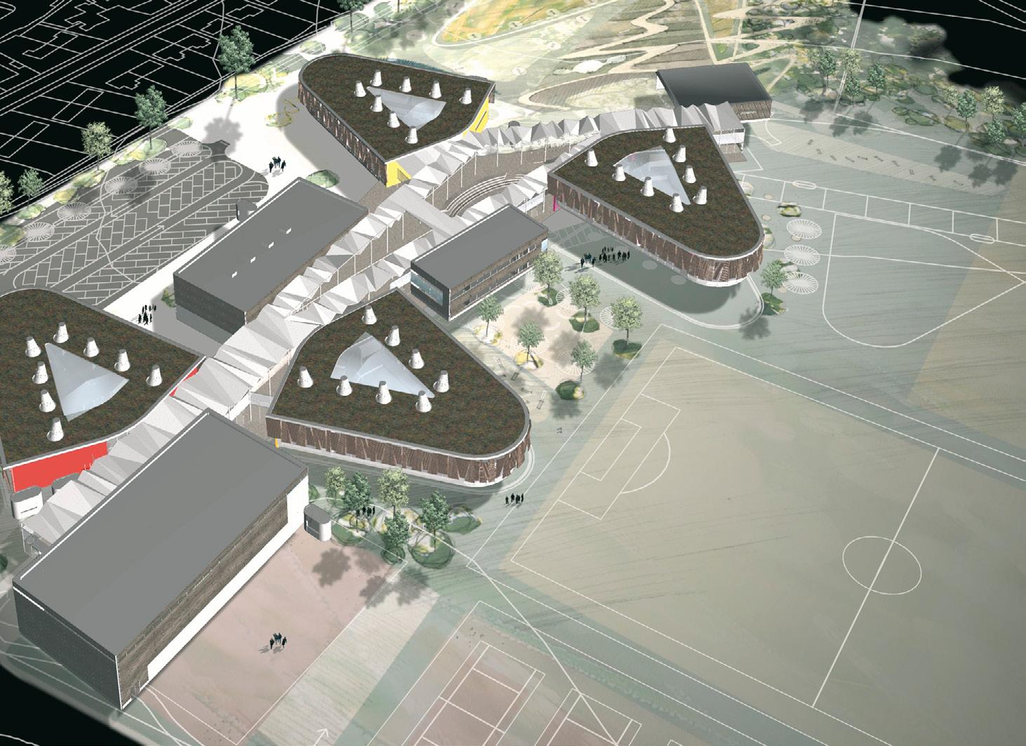 The sloping site is used to provide a change in scale across the campus, with singlestorey primary and SLD facilities at the top of the hill stepping down to more ‘civic’ two-storey accommodation around the main entrance.