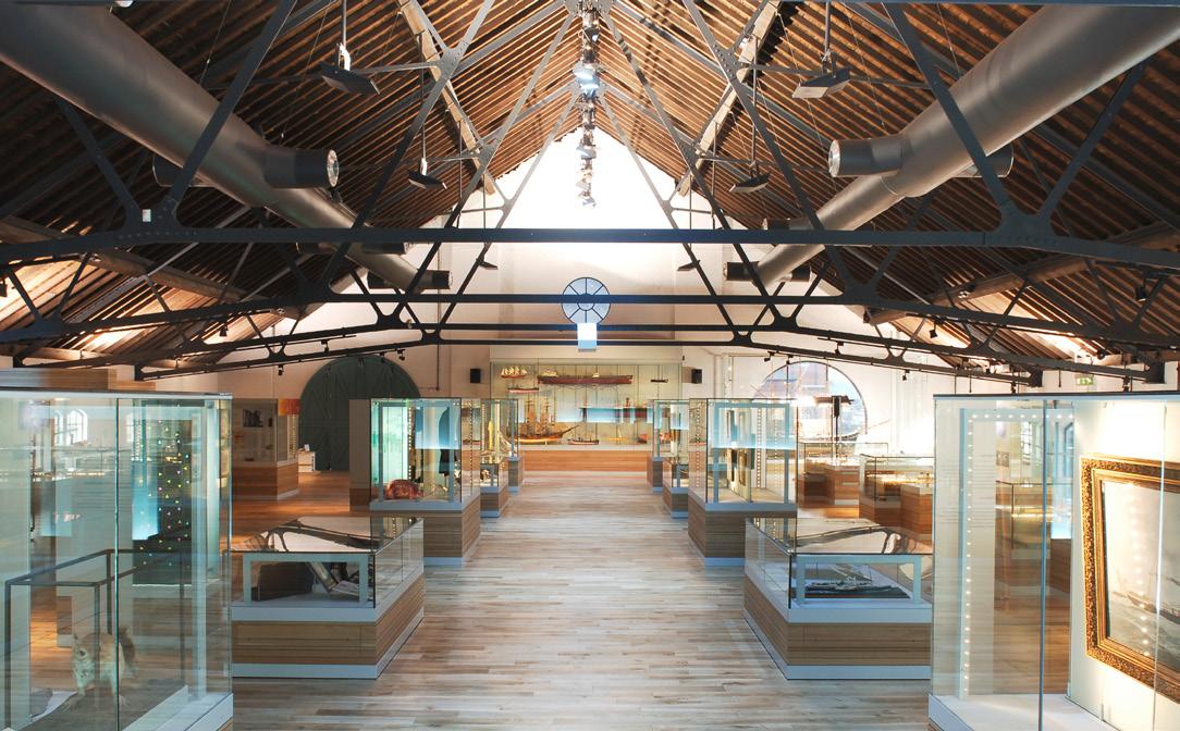 A virtual hull has been created alongside this to represent the missing section, within which the original artefacts are displayed in context. These context galleries run the length of the ship, corresponding to the original deck levels and leading to further gallery space at the end of the dry dock.