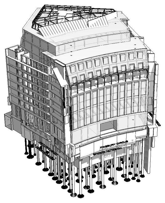 CIBC Square provides a major new mixeduse development and transport hub at the heart of the financial district. The scheme includes twin 250m-high towers flanking a rail corridor and linked at high level by a sky park, plus a new bus terminal for Metrolinx and connections into Toronto’s Union Station, subway and light-rail systems.