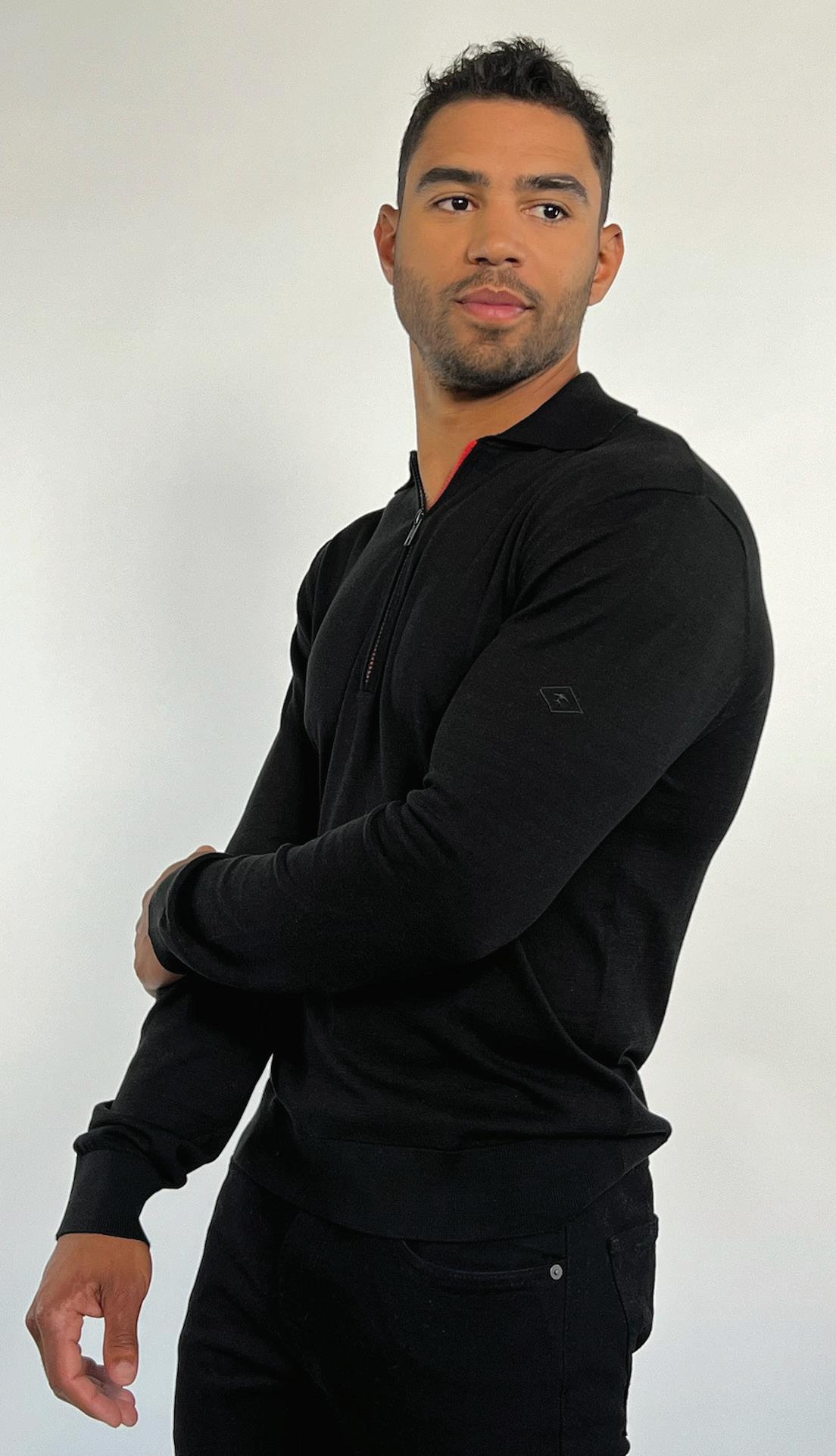 Description – The Soldier Polo in black 24-gauge spun silk and cotton, is defined with a red and black ¾ zipper that provide a cutting edge companion
