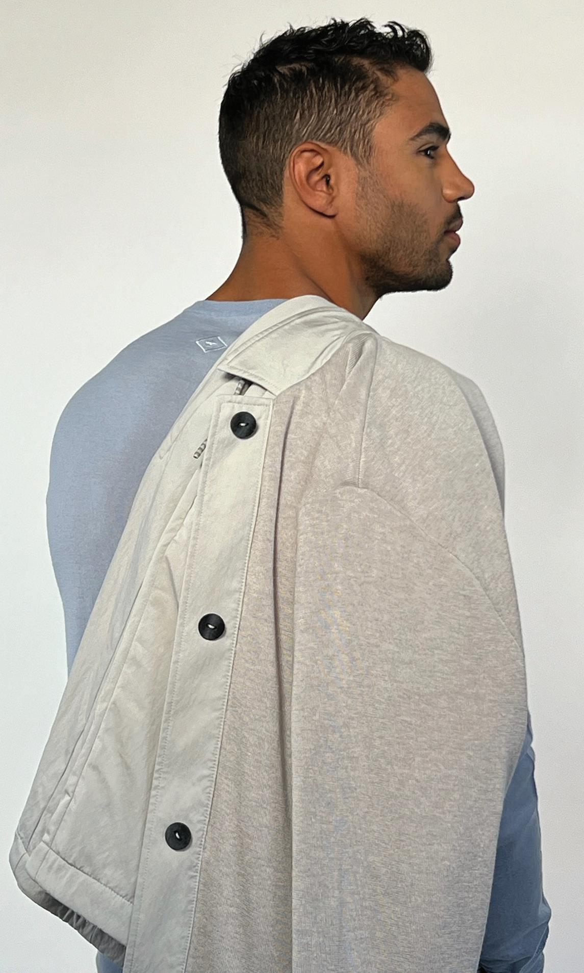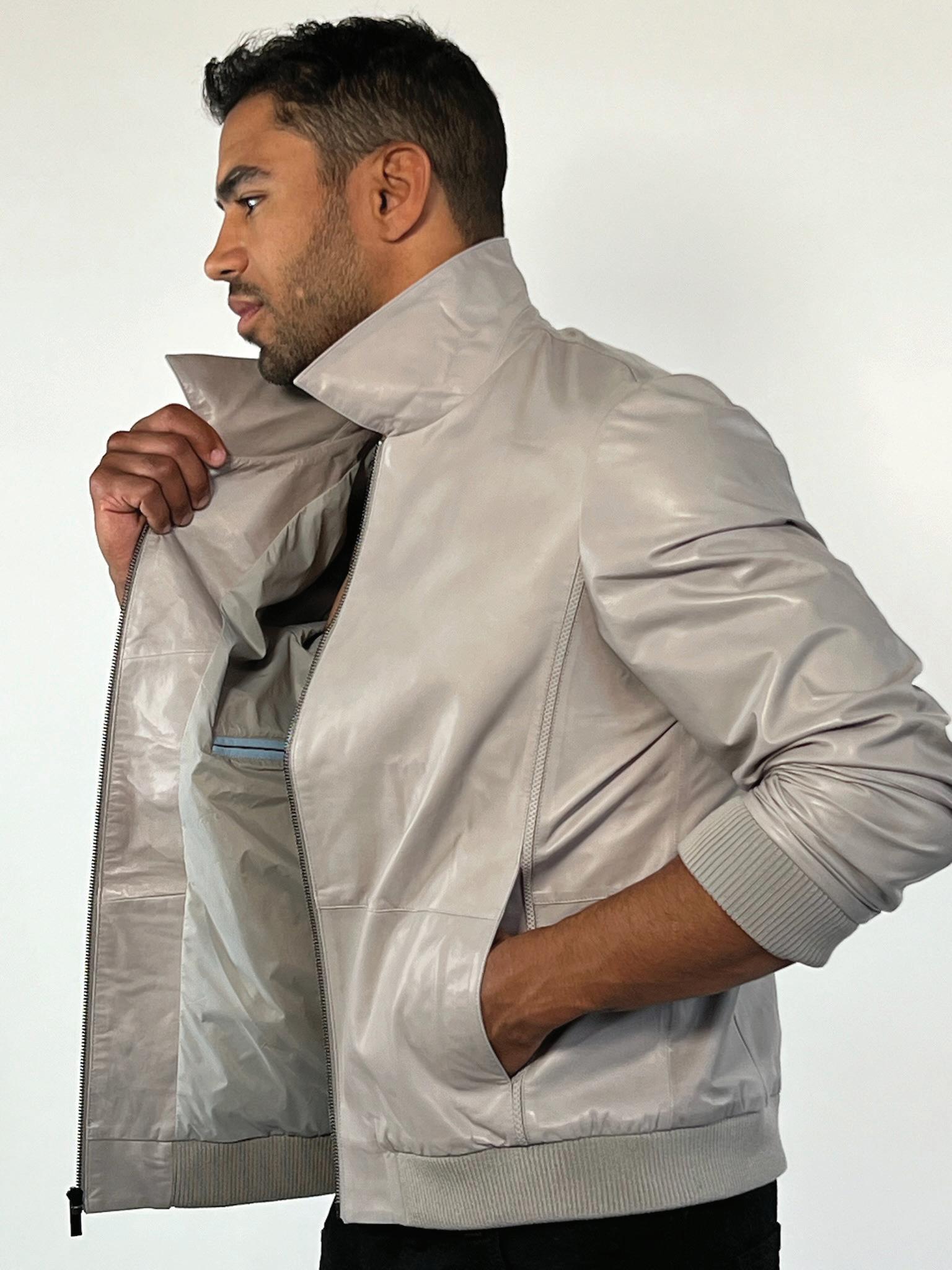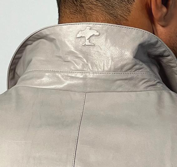 Description – With no top-stitching the Soho represents uncomplicated luxury. Upon opening the light grey colored jacket the wearer is greeted by interior sky-blue besom pockets providing a playful contrast