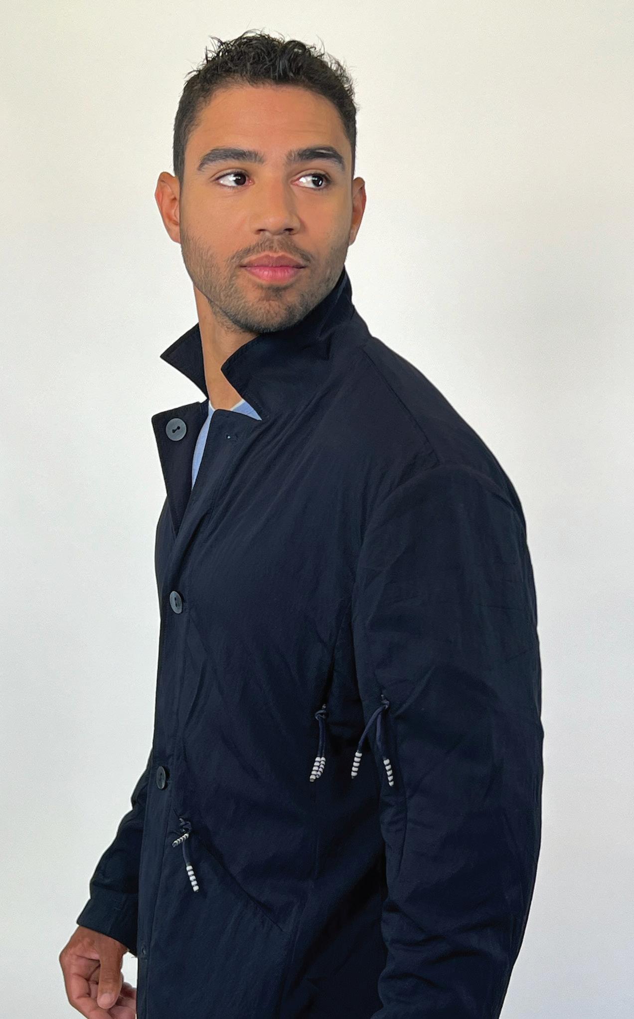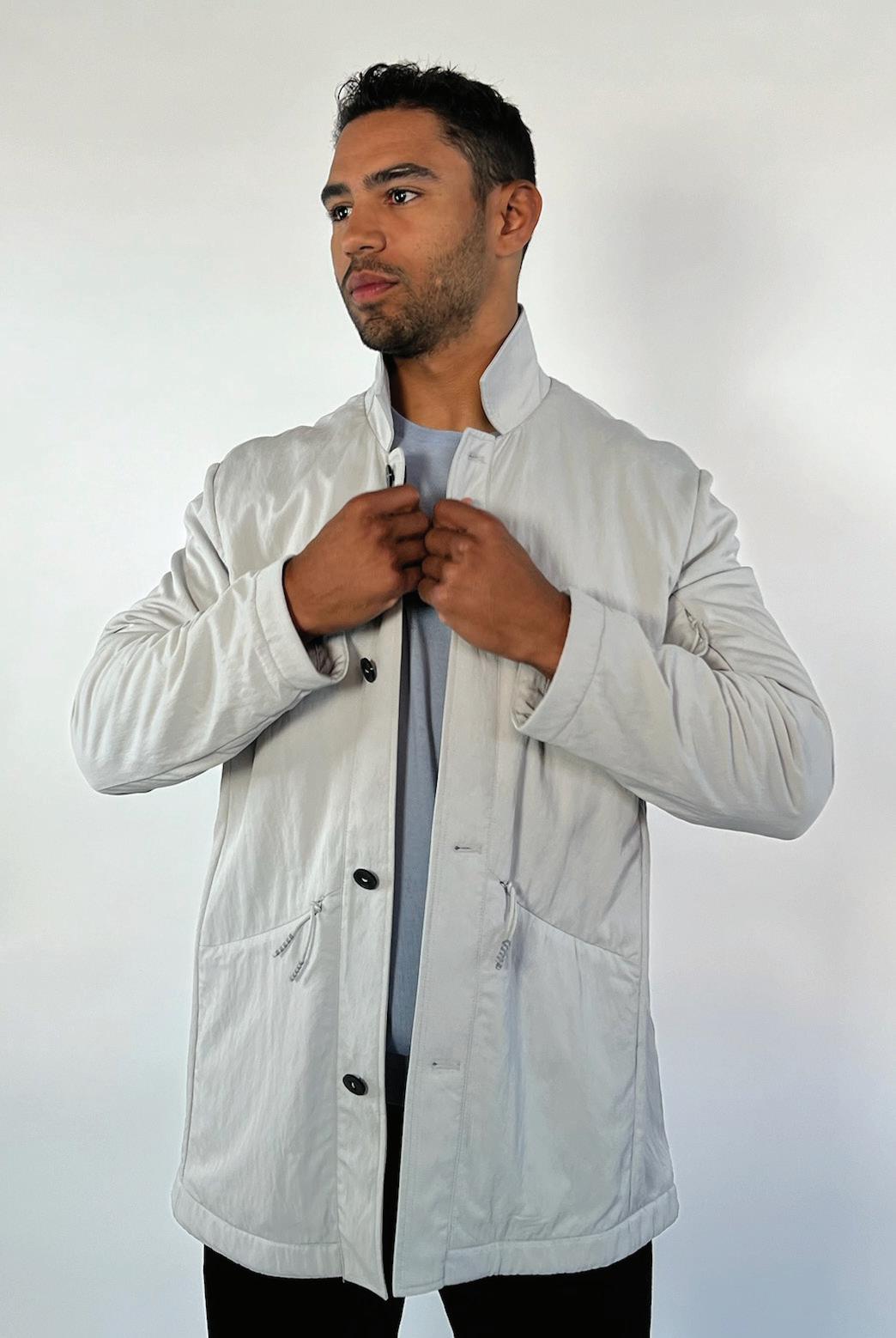 Description – Water resistant and breathable nylon reverse to 24-fine guage silk, mercerized wool and cashmere knit, providing a luxurious companion for early Spring and Summer evenings