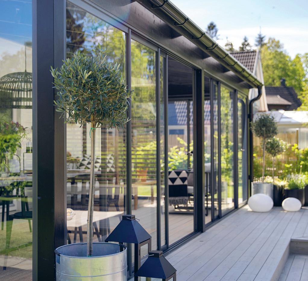 Med en udestue helt i aluminium og glas kan du skabe en urban, industriel stil. En diskret farveholdning sætter fokus på de store glasoverflader og indretningen. En udestue, som passer til mange forskellige huses design og integreres flot med det eksisterende hus.