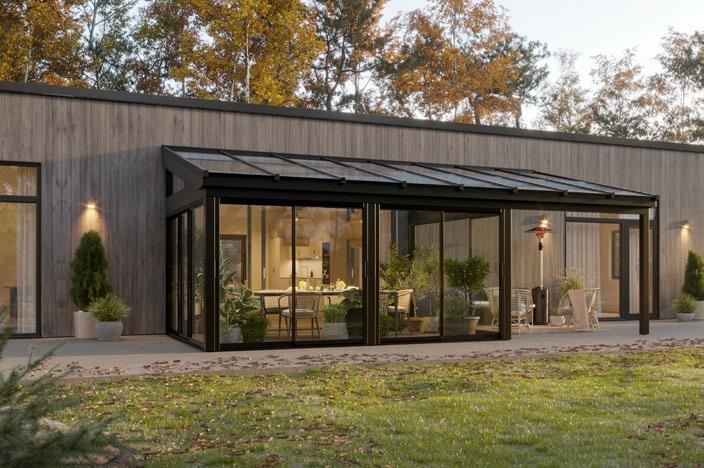 Et stilrent og velisoleret skydepartisystem til vinterhaven med store glasoverflader og håndtagsprofiler i unikt design.
