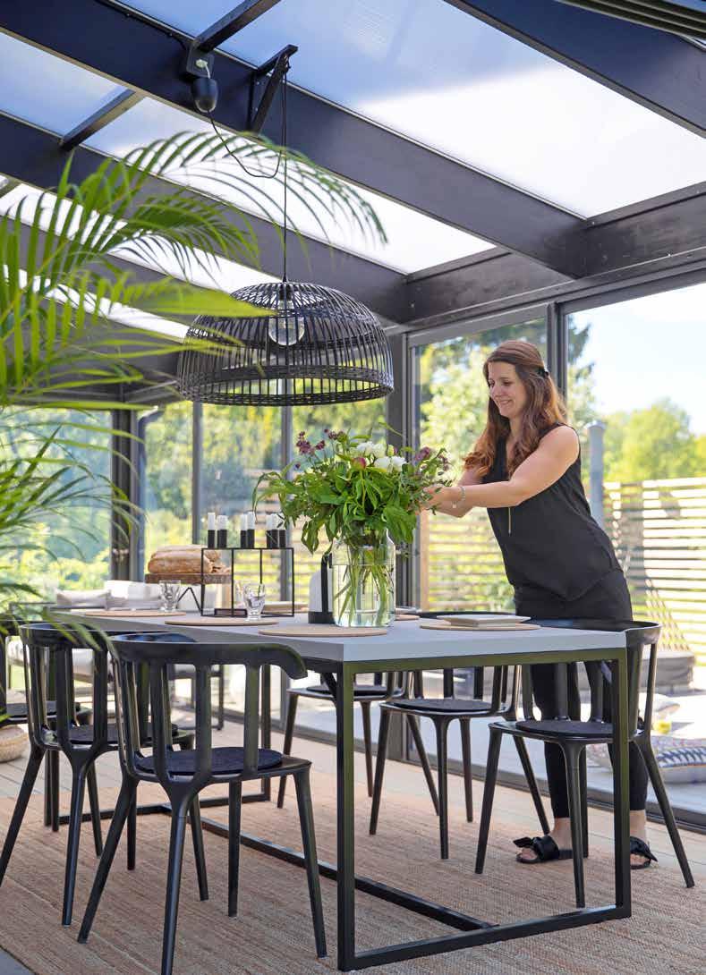 En stark och underhållsfri konstruktion, där lamellerna i taket låter dig sila solljuset för lagom skugga – eller stäng det helt.