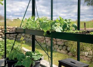 Ett växthus från Euro-Serre har rejäl sidhöjd – utnyttja den maximalt och få upp krukorna från golvet! Vi har en rymlig såbädd och aluminiumhyllor i två djup som du kan få lackerade i växthusets färg.
