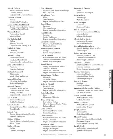 Yasmine Tarek Genena International Studies; Minor in Chinese Studies Lake Oswego, Oregon Garrett L. German Sociology Redding, California Evan Howard Abercrombie Giddings Economics, Rhetoric and Media Studies El Cerrito, California Natalie Elizabeth Giersch Politics; Minor in Music Grafton, Wisconsin Samuel L. Gonzรกlez Politics; Minor in Spanish Junction City, Oregon Joseph Ari Good History, Politics Costa Mesa, California Mason D. Granato Economics; Minor in Classical Studies Damascus, Oregon Degree Awarded January 2016 Perri T. Greeley Anthropology; Minor in English Spokane, Washington