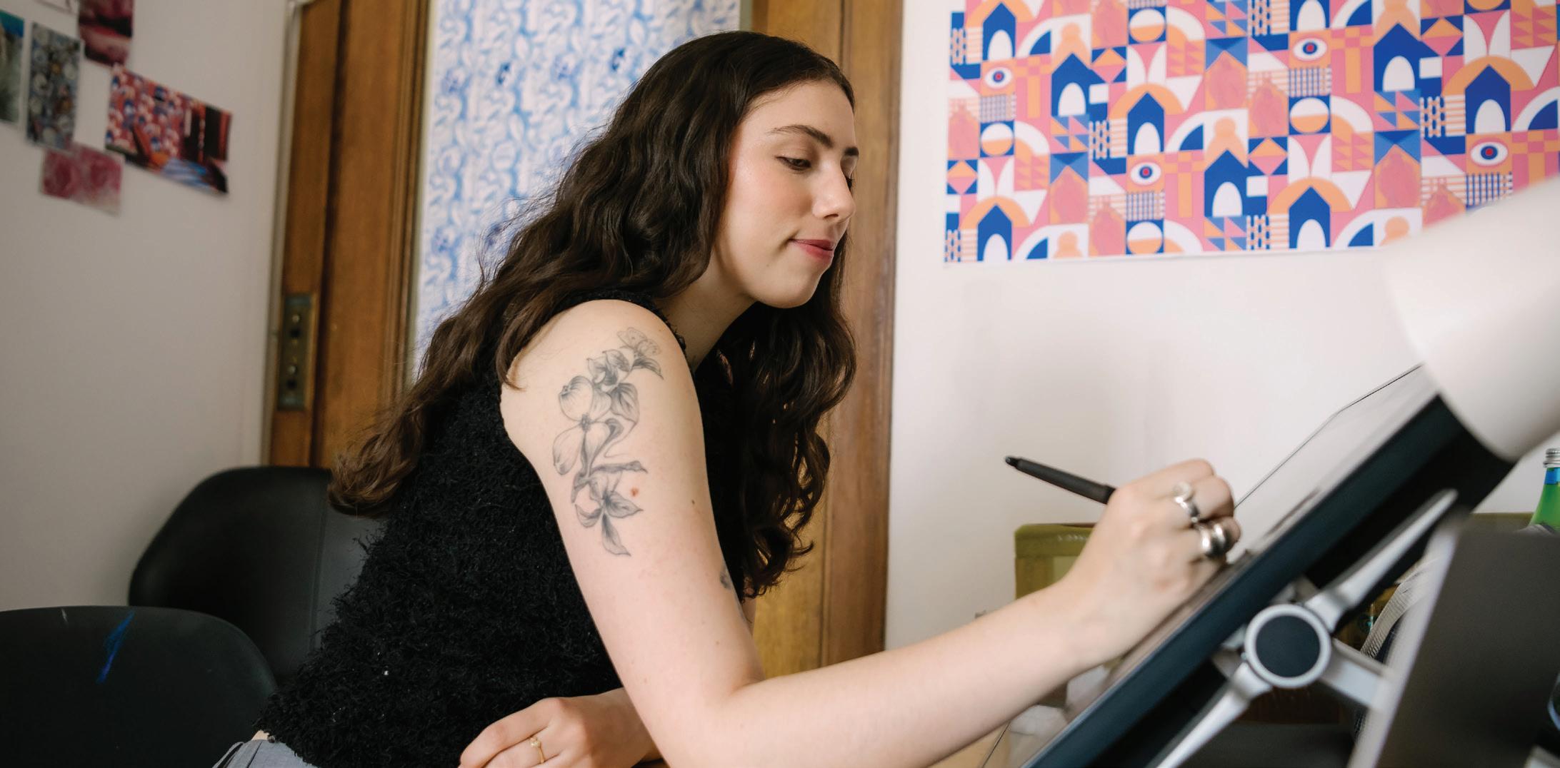 In Assistant Professor Zach Meyer’s Advanced Illustration Studio, Emily began to fnd her ft in a creative career. His class deepened her interest in color and material design, helping her integrate both with her illustration abilities. “Illustration is inspiring me to move into other felds,” she says. “There are so many avenues.”