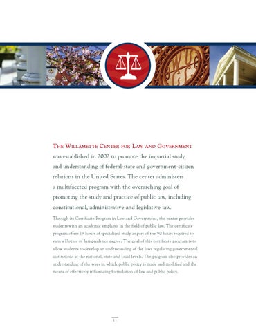 was established in 2002 to promote the impartial study and understanding of federal-state and government-citizen relations in the United States. The center administers a multifaceted program with the overarching goal of promoting the study and practice of public law, including constitutional, administrative and legislative law. Through its Certificate Program in Law and Government, the center provides students with an academic emphasis in the field of public law. The certificate program offers 19 hours of specialized study as part of the 90 hours required to earn a Doctor of Jurisprudence degree. The goal of this certificate program is to allow students to develop an understanding of the laws regulating governmental institutions at the national, state and local levels. The program also provides an understanding of the ways in which public policy is made and modified and the means of effectively influencing formulation of law and public policy.