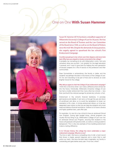 Susan M. Hammer JD’76 has been a steadfast supporter of Willamette University’s College of Law for 30 years. She has served on the Board of Trustees and the Law Committee of the Board since 1999, as well as on the Board of Visitors since the mid-’80s. Despite the demands of a busy practice, she eagerly agreed to spearhead the law school’s First Endowment Campaign. Countless people go to law school, earn their degrees and never look back. Why have you stayed so closely connected to the college? It probably has something to do with Willamette’s motto: Not unto ourselves alone are we born. I am grateful for the legal education I received, and I want to give back by helping the next generation of lawyers prepare for a life of service to the profession and their communities. Dean Symeonides is extraordinary, the faculty is stellar, and the students are perhaps the best in the history of the College of Law. It’s fun and rewarding to be part of that and to envision an even brighter future for the college. Why did you agree to chair the College of Law endowment campaign? I think this is the time when I can make a difference that will last far into the future. Historically, Willamette University College of Law has had a smaller endowment than many other law schools — less than one-fourth the national average for private law schools, in fact. Endowment is the school’s financial backbone. It provides permanence and stability. It can carry us through the ups and down of enrollment and allow us to avoid the temptation to lower our standards to fill a class. A strong endowment allows us to be less dependent upon tuition so that we can help the students who most need and deserve financial assistance. It allows us to have a diverse and highly qualified class, year after year. For example, it is rare for a law school to have an endowed Clinical Law Program. During tight budget times, clinical programs are usually the first thing to go. Willamette’s College of Law now has an endowed Clinical Law Program, assuring that students in the future will graduate with practice skills, as well as a strong academic background. This is only one example of how building endowment makes a lasting difference. In its 122-year history, the college has never undertaken a major endowment campaign. Why do so now? The time is right. We have a compelling story to tell, a track record that shows a steady upward trajectory and a vision that is well within our reach. We have the best dean imaginable; our faculty is outstanding and gets better every year. If not now, when?