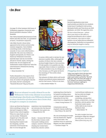 Flagging down Tufton Tufton was tough to find in the last issue of Willamette magazine. Only a few eagle-eyed readers spotted the “Beamish Bearcats” flag in the lower left image on p. 27. Where’s our elusive friend hiding this time? Send your sightings to magazine@willamette.edu.