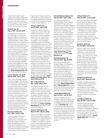 middle school English, social studies and journalism in Palo Alto, California, from 1959 to 1991, when he and his wife, Ollie, retired to Ashland, Oregon. Survivors include his wife of 53 years, Ollie; brother, Charles; and sons Brian and Keith. Donald R. Neu ’59 Aug. 6, 1937 – April 14, 2016 Donald Robert Neu was born in Twin Falls, Idaho. He earned his bachelor’s degree in education at Willamette and went on to teach physical education in Salem, before settling into a 33-year career in auto claims and attorney negotiations with State Farm Insurance in Seattle and Tempe, Arizona. A star polevaulter in high school, he remained active in sports throughout his life. Don played softball for 40 years and coached soccer and basketball at the YMCA for many years. At the age of 53, he picked up tennis and achieved numerous accolades in the sport, becoming nationally ranked in both singles and doubles, and earning certification from the United States Professional Tennis Association. Survivors include his wife, Sandy (Stageberg) Neu ’63, and children Kendall and Jeffrey. Loren F. Alexander ’62, JD’65 April 13, 1940 – June 9, 2016 Loren Francis Alexander was born in Portland, Oregon. After earning both his bachelor’s and law degrees from Willamette, Loren became a successful entrepreneur in Oregon and later in Texas. He was owner and CEO of the RTS Corporation, a software development, marketing and service company. Even in retirement, Loren continued to work as a business consultant. In 2010, he moved to Ventura, California, to enjoy life on the beach and to spend time with family and friends. Survivors include his sister, Marilee; partner, Carol; children Kellee, Christine, Michelle and Sarah; and stepchildren Jennifer and Jeffrey. Rosemary Stanbery ’62 Feb. 1, 1941 – July 14, 2016 A lifelong resident of Portland, Oregon, Rosemary Stanbery graduated from Willamette with a bachelor’s degree in English before also graduating from the University of Washington. She taught advanced high school English and American studies for more than 30 years, mostly at Clackamas 52