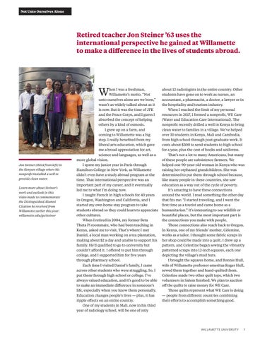 hen I was a freshman, Willamette’s motto, “Not unto ourselves alone are we born,” wasn’t as widely talked about as it is now. But it was the time of JFK and the Peace Corps, and I guess I absorbed the concept of helping others by a kind of osmosis. I grew up on a farm, and coming to Willamette was a big step. I really benefited from my liberal arts education, which gave me a broad appreciation for art, science and languages, as well as a more global vision. I spent my junior year in Paris through Hamilton College in New York, as Willamette didn’t even have a study abroad program at the time. That international perspective was an important part of my career, and it eventually led me to what I’m doing now. I taught French in high schools for 40 years in Oregon, Washington and California, and I started my own home stay program to take students abroad so they could learn to appreciate other cultures. When I retired in 2004, my former Beta Theta Pi roommate, who had been teaching in Kenya, asked me to visit. That’s where I met Daniel, a local man working on a tea plantation, making about $2 a day and unable to support his family. He’d qualified to go to university but couldn’t afford it. I offered to put him through college, and I supported him for five years through pharmacy school. Each time I visited Daniel’s family, I came across other students who were struggling. So, I put them through high school or college. I’ve always valued education, and it’s good to be able to make an immediate difference in someone’s life, especially when you know them personally. Education changes people’s lives — plus, it has ripple effects on an entire country. One of my students in Mali, now in his third year of radiology school, will be one of only