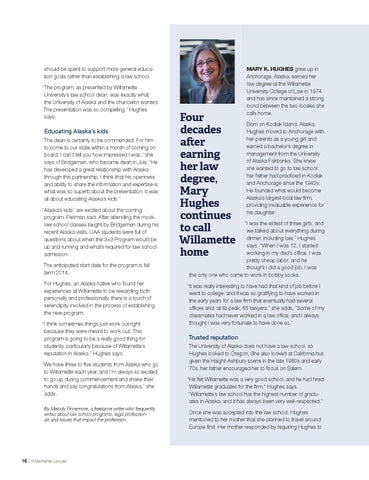 should be spent to support more general education goals rather than establishing a law school. “The program, as presented by Willamette University’s law school dean, was exactly what the University of Alaska and the chancellor wanted. The presentation was so compelling,” Hughes says.