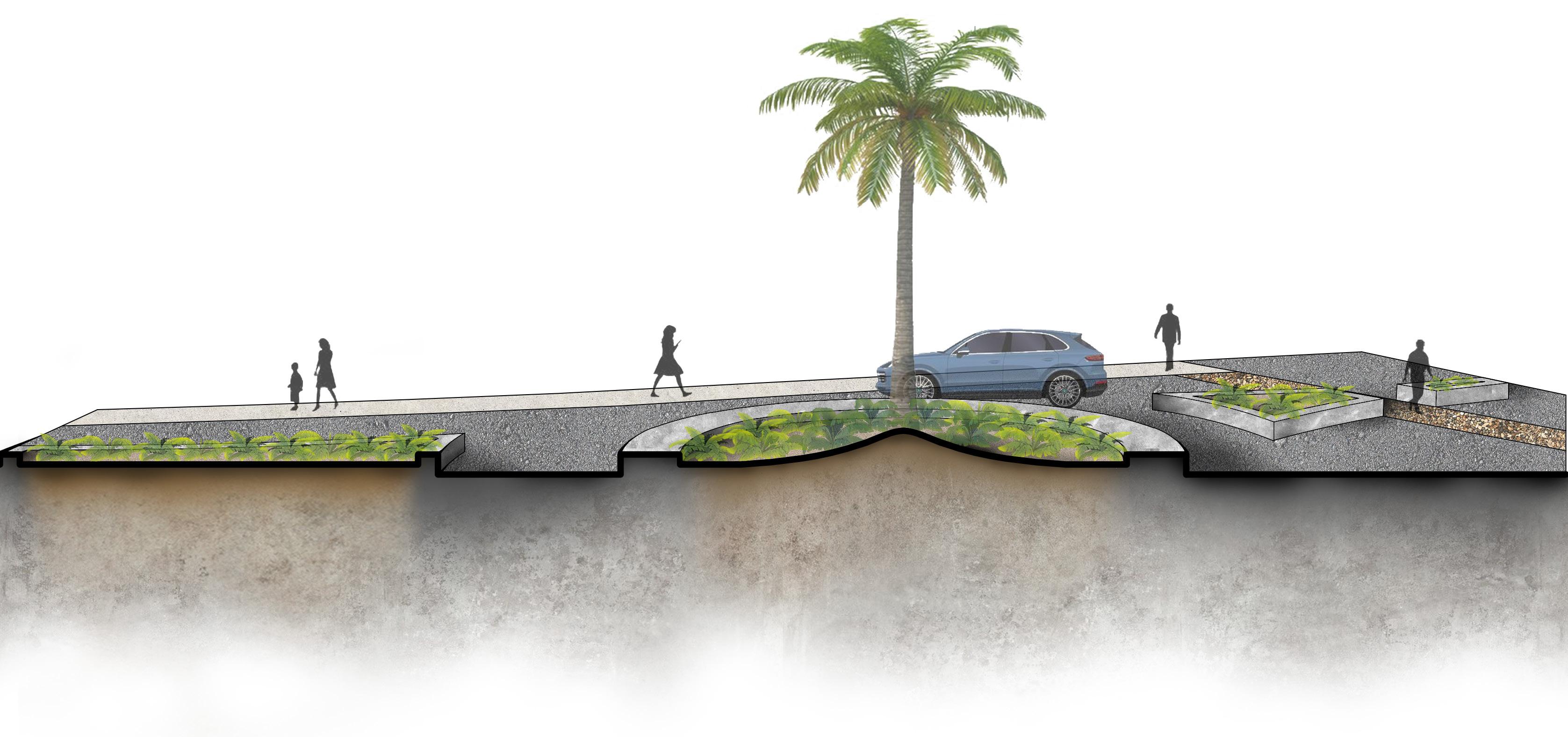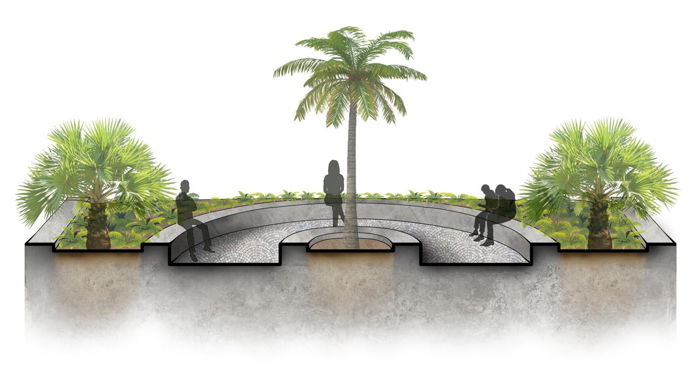 My last section is the Sustainable Streetscape, which implements natural vegetation restorations and sustainable local art for interest. Tarpum Bay was once lined with palm trees across the beach, stabilizing the sand, withstanding high wind speeds, and dampening the impact of tropical storms. Due to the limited space along the beach, I wanted to revitalize these components in small areas across the water and, more importantly, along the sidewalk.