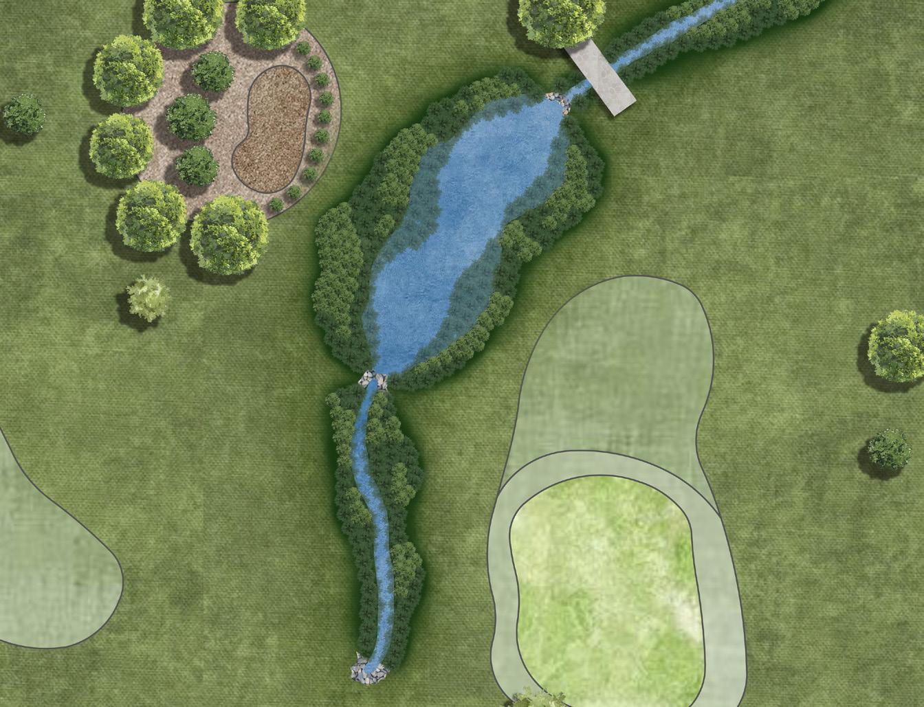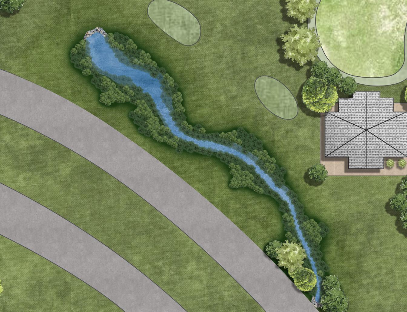 For my master plan, I wanted to highlight the riparian zones and display the area the proposed stream channel would occupy. The site currently does not have a vegetation buffer between the golf course and the stream channel. I want to utilize native grasses and shrubs to not only create a buffer to protect from erosion but also improve water quality by filtering stormwater pollutants, cooling the water temperature, slowing flow velocity, and providing habitats for wildlife.