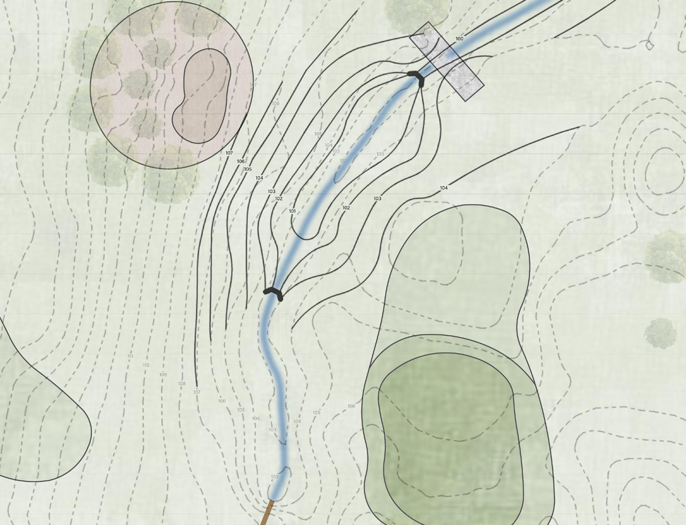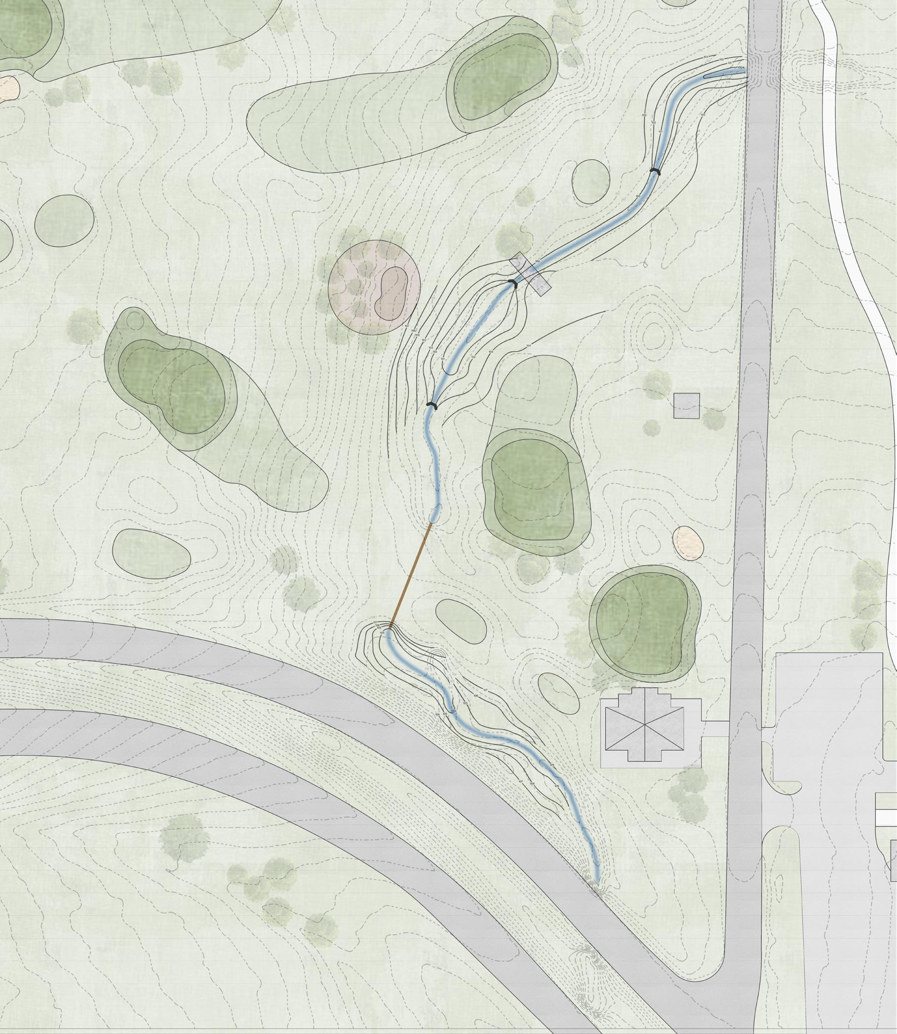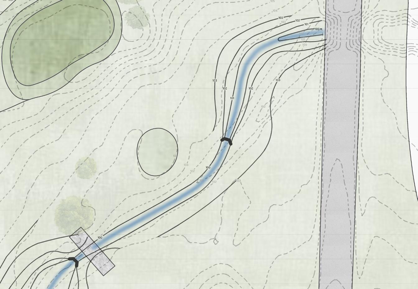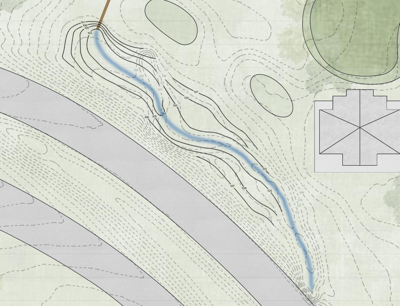 The grading plan for this site consists of proposed topography that manipulates the stream path to provide for riparian zone areas for the water to be controlled. I shifted the culvert west to separate the distance between new riparian zones and the existing tee box. I proposed threegrade control structures allowing slower water movement along the stream channel to prevent severe erosion along the bed and bank. The grade control structures are walls composed of boulders and large rocks that naturally descend the stream one foot to let the rest of the course have a minimal slope to keep the velocity of the stream slow. The stream channel has been broken up into three reaches. These reaches all manipulate the topography differently to create more area for water to pool and soak into the ground efficiently.