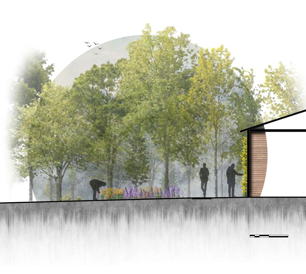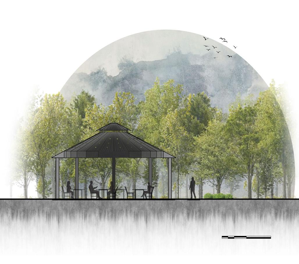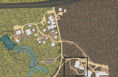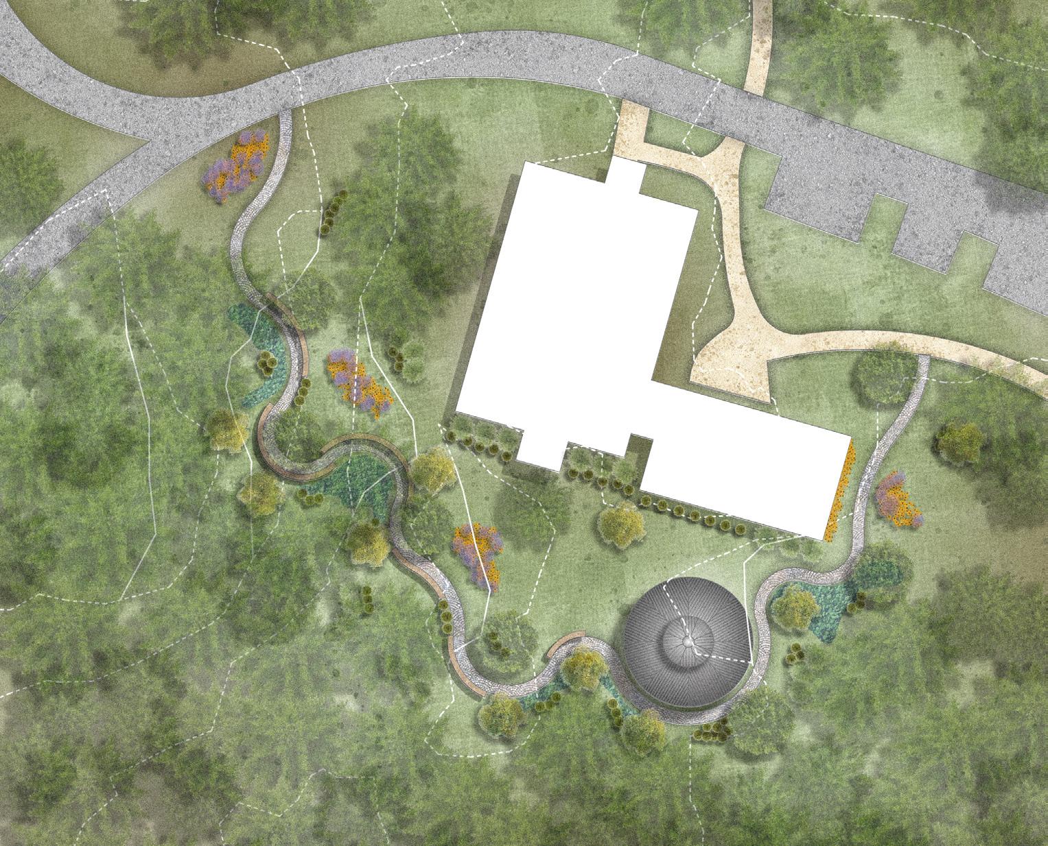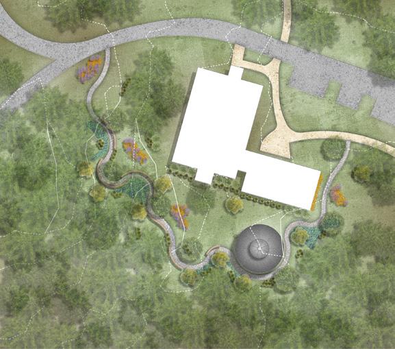 lack of outdoor spaces to do so. This design emphasizes the direct connection that the researchers can have with eachother and the natural environment by creating gathering spaces within the native pines. A simple gravel path takes one through the understory of large pines with adjacent organic benches that give pedestrians an opportunity to soak in nature. These elongated benches offer opportunities for people to gather with one another and ultimatly create a deeper connection with the people staying with them at the Hobcaw Barony.