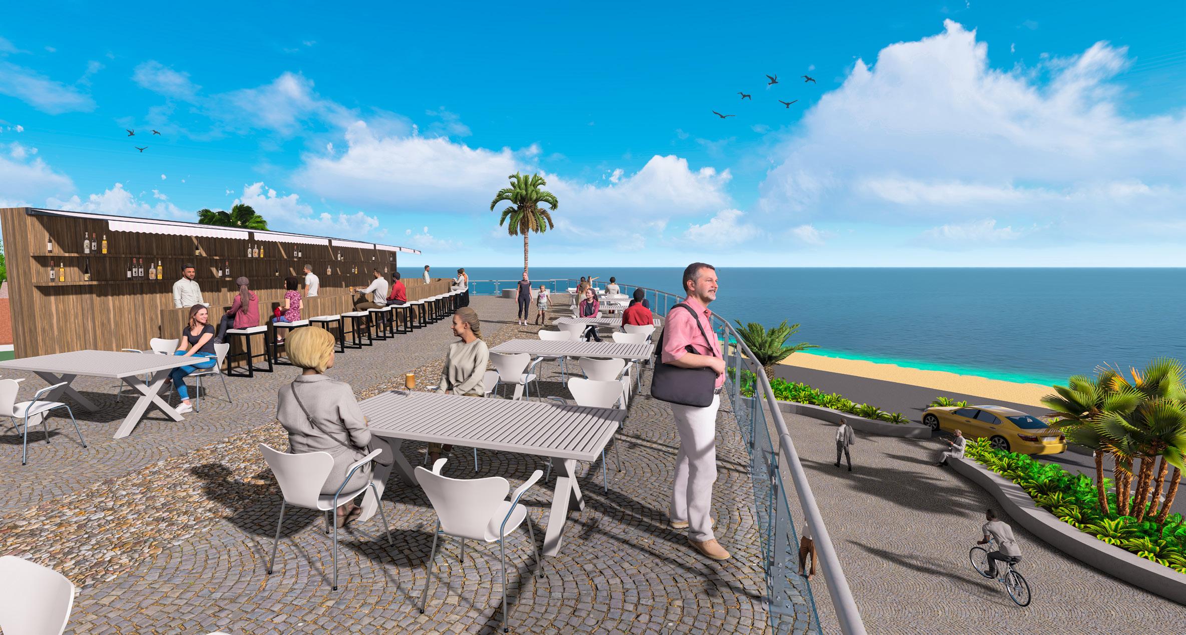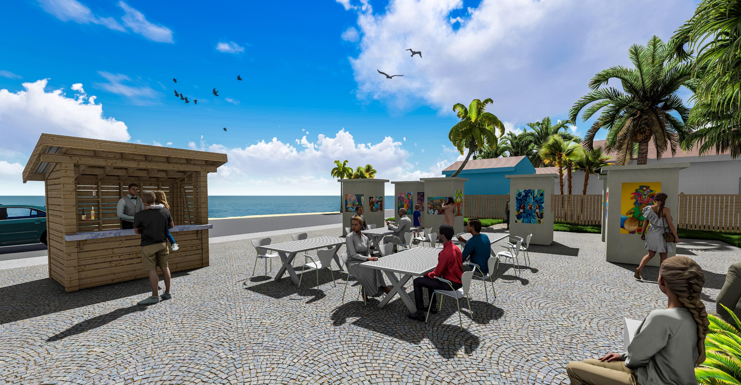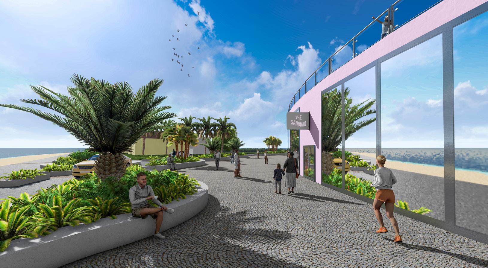 Behind the art canvases, a path connects the original Seaside Breeze Restaurant to the rest of the park, creating a cohesive flow throughout the development and incorporating the original restaurant with new expansions. It is necessary not to isolate existing local businesses but to help them thrive in changing environments.
