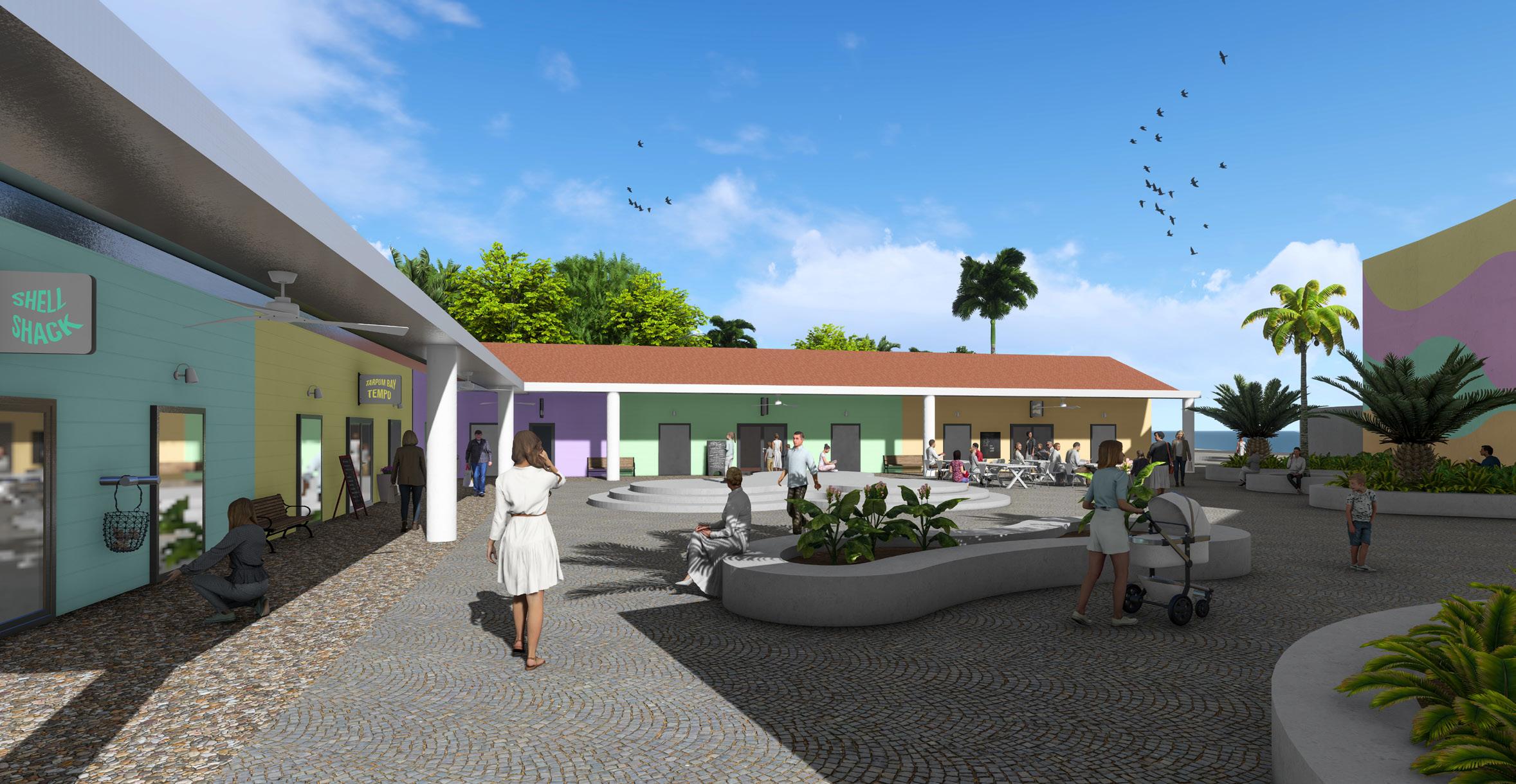 This downtown center includes five sustainable activities that display the culture of Tarpum Bay. These activities include conch shell painting, sand/ shell jewelry making, local art painting, conch/ local food cooking, and cultural music making. These businesses can be locally employed and provide opportunities to teach consumers about the local culture. The site is heightened with pastel colors and native plantings to provide a cohesive aesthetic with the rest of the town.