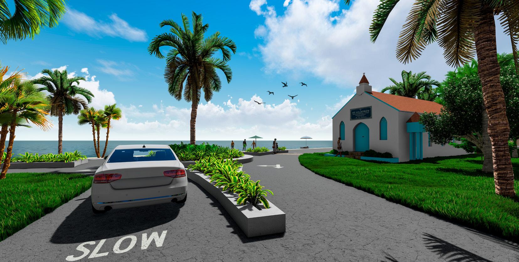 This roundabout was placed on Queen’s Highway next to St. Columbia’s Anglican Church as a grand welcoming into Tarpum Bay. The community treasures this church for its charming aesthetic and rich history as one of the oldest buildings in the entire town. As tourists and locals approach the town, they see the historic church, fanning palm trees, and the clear ocean in the background as a grand sense of arrival into this new development of Tarpum Bay.