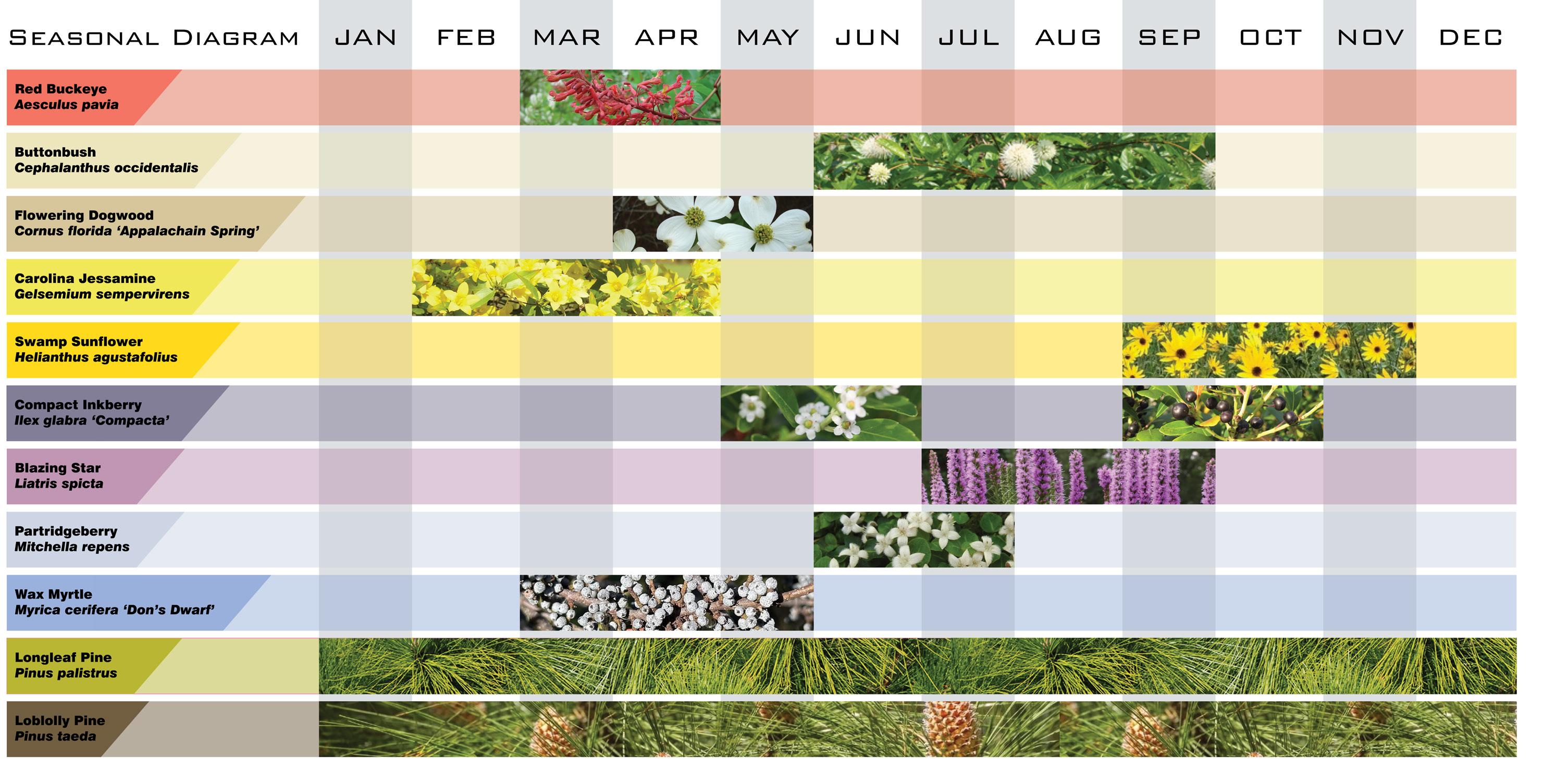A priority of this planting plan was to make all seasons have interest making the walkway ever changing during the year. Flowers bloom throughout majority of the year and evergreens shine in the winter. During the Winter months evergreens are the forefront of the planting design. Nearing the end of the spring the Red Buckeye and Flowering Dogwood are in both in bloom to