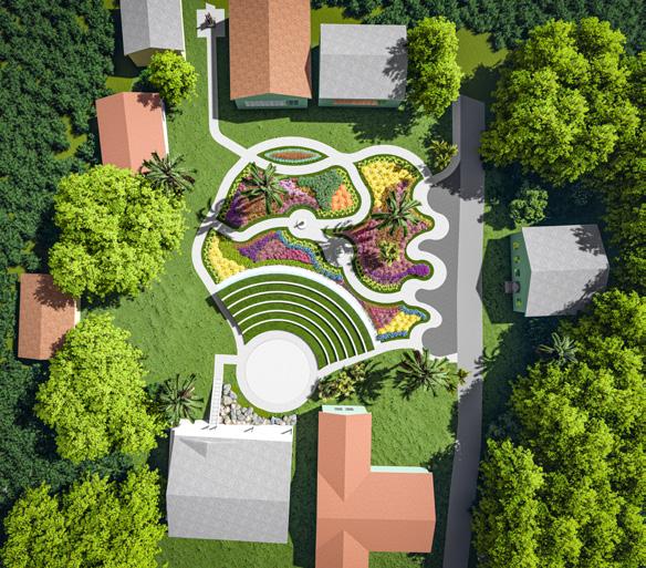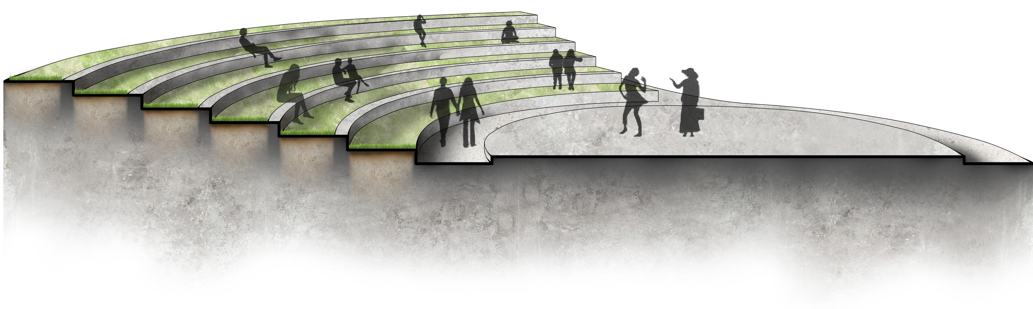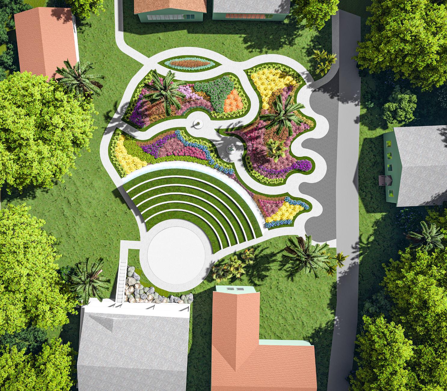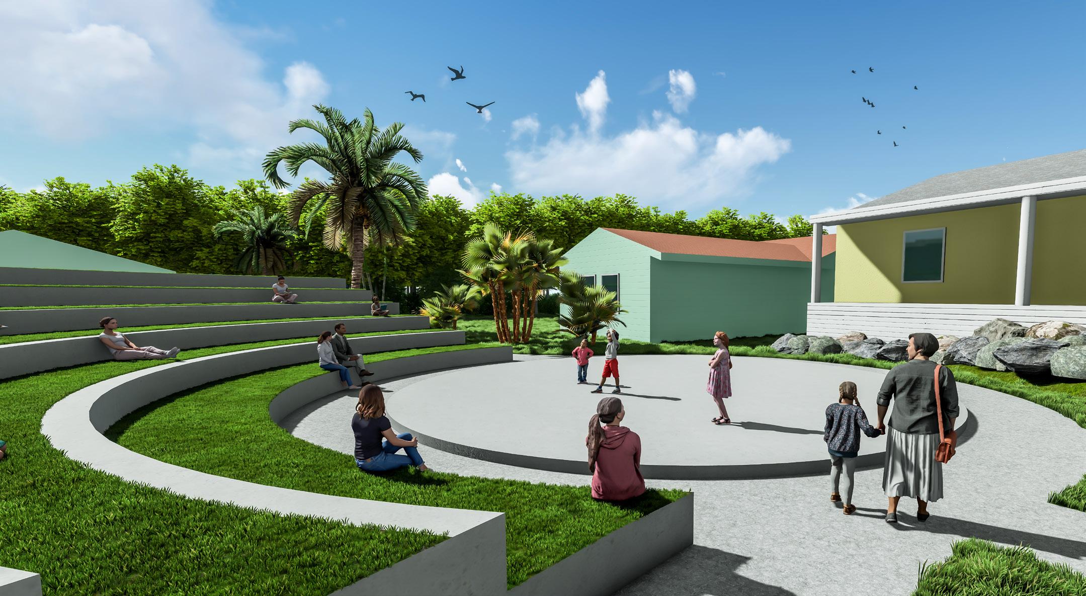 Previously, in this area, a stage was developed and quickly became overgrown by the need for more local use. I wanted to design a space that would be used and attractive to the public. This amphitheater provides a sustainable approach by implementing grass on the steps to have sufficient water draining into the soil and maintain a cool environment in the extreme heat of the Bahamas. These natural steps cool down the area and limit heat exhaustion for locals and Tourists visiting the garden.