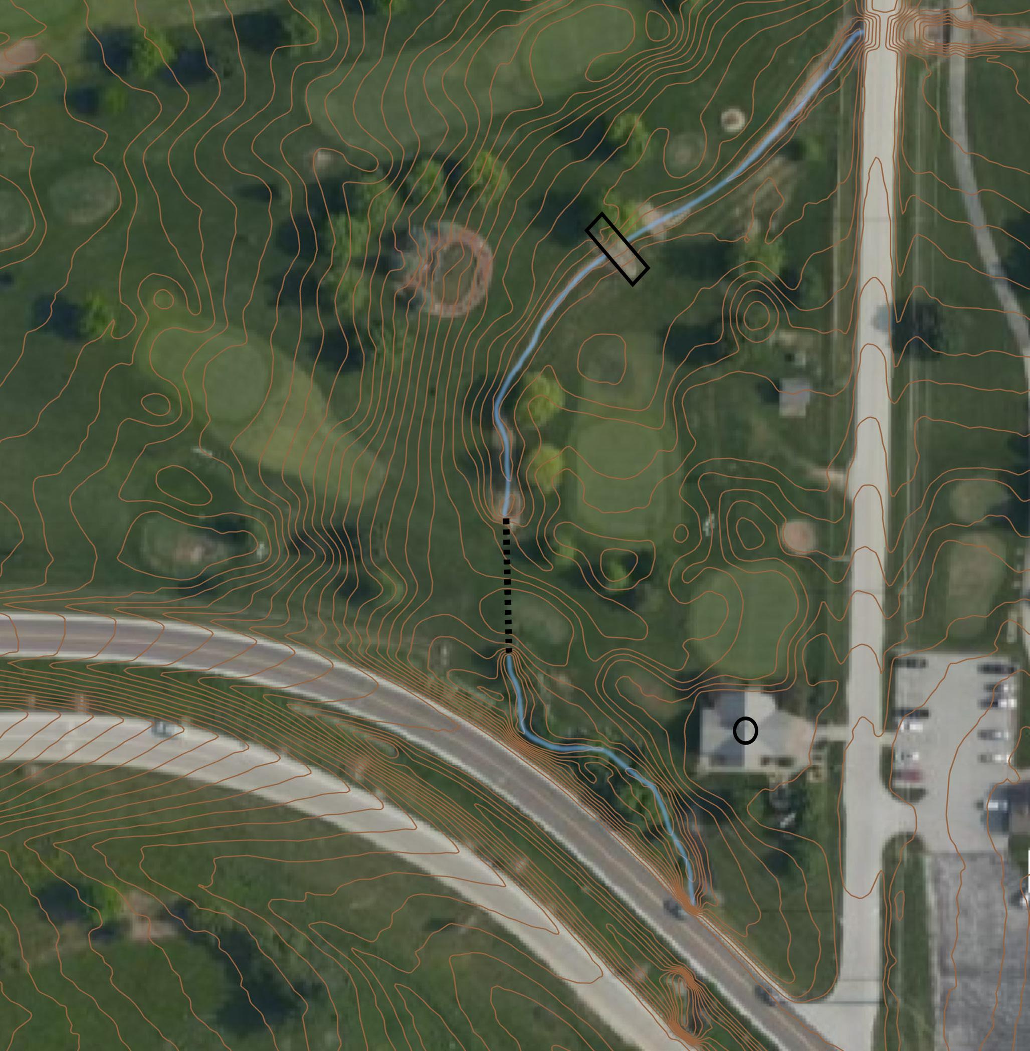 For my site analysis, I wanted to first establish the existing factors along the stream channel. The channel is composed of rock and dirt manipulated and eroded over time. The culvert entrance and exit are fully exposed, with no protection surrounding them, gradually deteriorating the surrounding environment over time. City-provided Lidar topographic data displays a 1-foot contours over the golf course, revealing a confined channel with the lack of sufficient riparian overbank for floodwaters to pool. The on-site images show direct examples of the impact of a lack of stormwater retention areas and the absence of natural riparian zones. The Golf course wanted a functional system and an aesthetically appealing site that the golfers could experience.