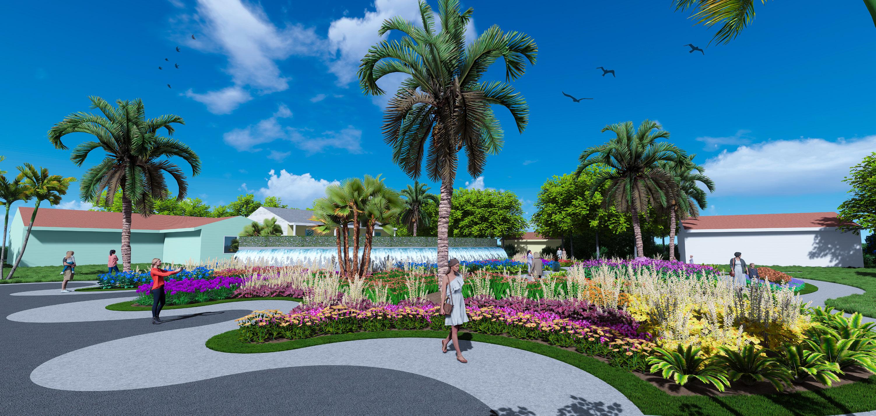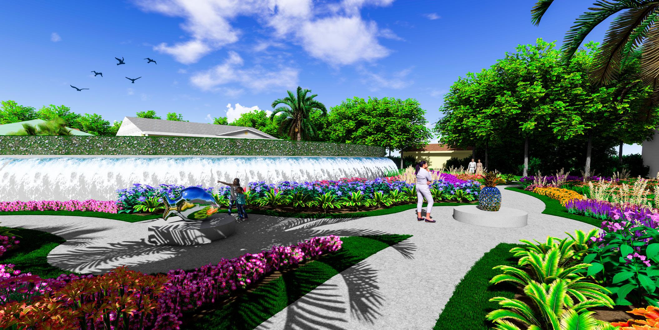 The statue’s display functions as the center point of the garden. It is designed in a figure eight path around two chrome statues. The centerpoint gives access to all different parts of the garden, including the amphitheater, gravel waves, community arts and cultural center, and all exits. The garden showcases various vibrant plants and flowers that revitalize the native plants of Tarpum Bay.