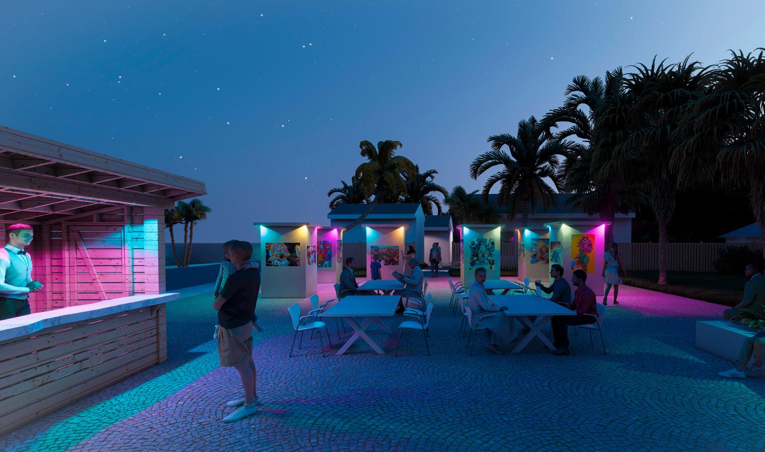 The luminescent lights turn on at night and illuminate the entire park. The walls of the painting include pastel lights that shine down on them, attracting people to go closer and take a look at the local art. The lights continue down the sidewalk, making traveling from one part of town to the other safe and enjoyable when the sun sets. These lights continue throughout each new development to provide an experience for the pedestrians throughout this beachfront town.