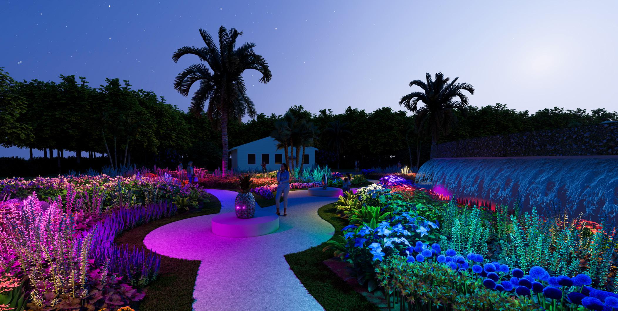 A waterfall flows out the back of the amphitheater into a shallow pool to create a sense of movement and activity in the garden. When the sun sets, neon pastel lights activate and glow throughout the garden to provide a luminescent feel while walking around. I wanted to keep the pastel theme throughout the garden at night to make every location in the development feel cohesive. The garden transforms and creates a new appeal at night.