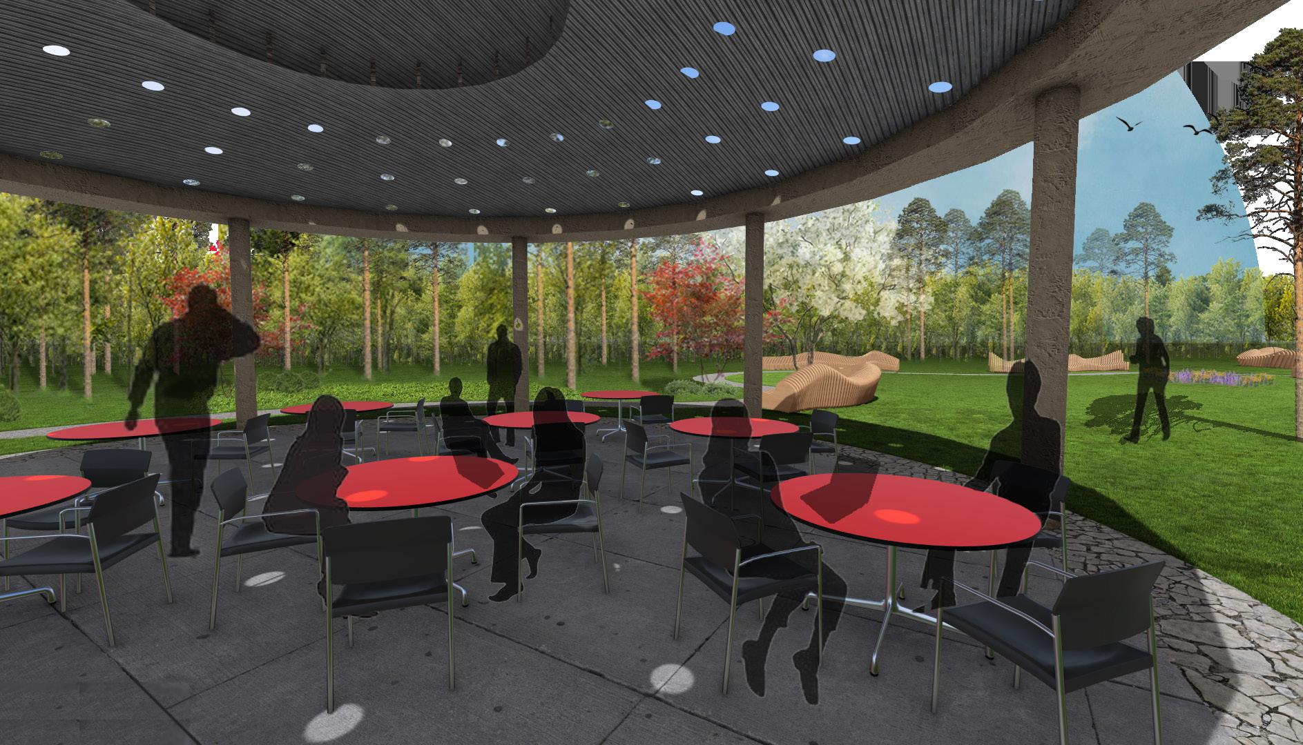 A pergola sits behind the research center as a gathering space that students can relax and do work outside. The pergola structure has circular holes that are covered with structural acrylic to resemble the sports on the Red-cockaded Woodpecker. Light shines through these holes into the understory of the pergola to remind the students of the special land they are on. Red tables, further resemble the Red-cockaded Woodpecker by the infamous red streak that these birds have on their heads. This pergola at heart emphasizes community and natural interaction.