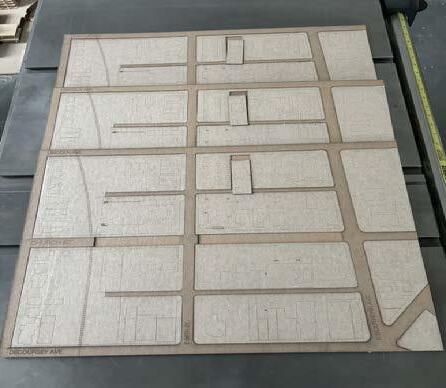 I was able to build four physical models, three of the initial campus scenarios and an additional one later which consisted of a combination of the initial three scenarios based on feedback from the Holy Cross community. Being able to visually see and physically move pieces around was pivotal in driving their decision making. Chipboard was used for the base, basswood was used for the existing, clear acrylic sheets were used for new build.