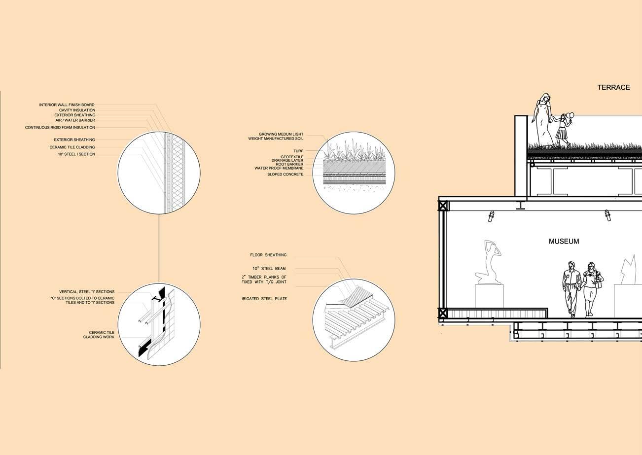 Given that the building will be used my many different groups of people, the proposal attempts to create a balance between public and private. With administration/research being more private, they have their own skybridge on the third level. The public can go through the skybridge on the second level with no interruptions from one end to the opposite end if they are not visiting the museum gallery. For the people who are visiting the museum gallery, they can take the elevator/stairs up to the third level and rooftop terrace.