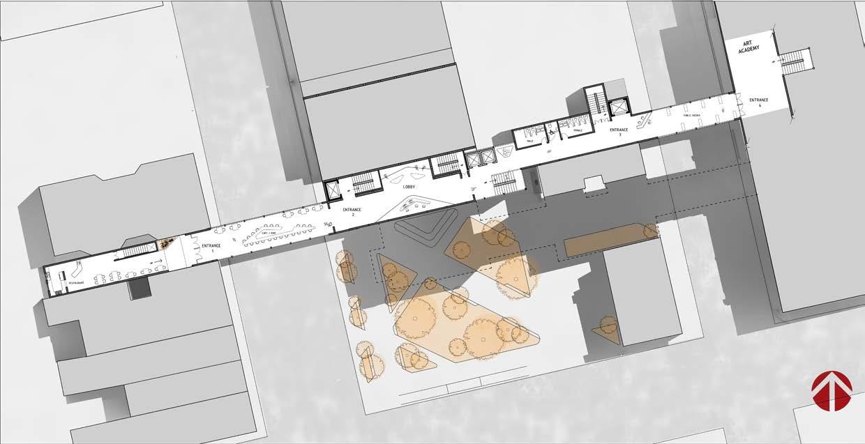 The location of the project is at the prominent corner of 12th and Vine Street in Cincinnati, Ohio’s historic Over-the-Rhine neighborhood. The program is a museum dedicated to the History of Over the Rhine: a place to celebrate the past and future of one of Cincinnati’s first and most historic neighborhoods. The proposed building aims to build community through connection as well as pay homage to the various bridges that were onced used to cross the Miami and Erie Canal, which was nicknamed “the Rhine”. The significance of the Rhine back then, correlates to the significance of Vine Street today. The building is meant to be a public resource to educate visitors about the materials and construction legacy of Cincinnati, particularly Over-the-Rhine. The facility will comprise of a visitor’s center, meeting areas, a library, permanent museum, as well as archives,