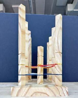 Concept models were created to quickly and creatively express our ideas and vision clearly. Blocks used as buildings with markings to represent three levels of programs. Red, blue, and yellow ribbons wrapped around each level to represent parking, plazas, and platforms.