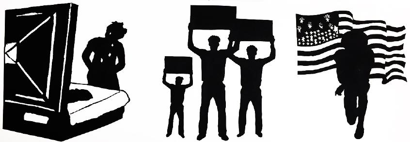 Objective was to create a narrative out of only silhouettes using black construction paper. The fact silhouettes only give a view of an object or a scene consisting of just the outline of the subject’s contour with a featureless interior challenged us to think critically. I learned to convey a story using imagery, symbols and composition choices to reveal elements from a story while encouraging the viewer’s imagination. Influenced and inspired greatly by Kara Walker’s use of this style of art to tell captivating stories, specifically about African-American struggles.