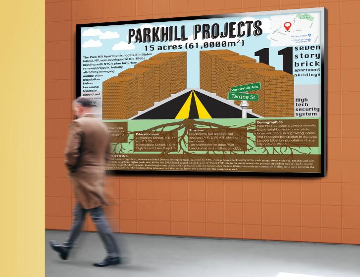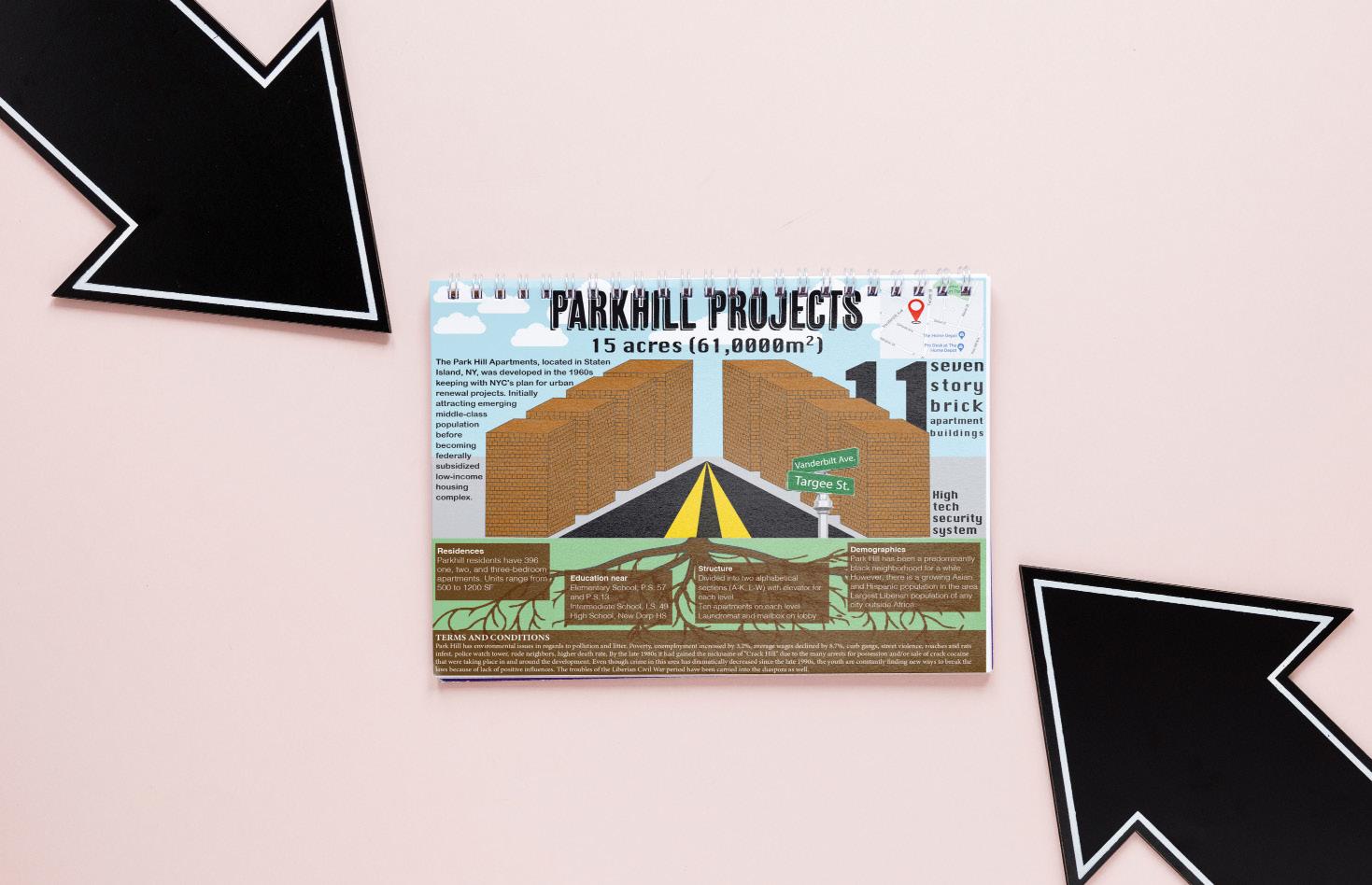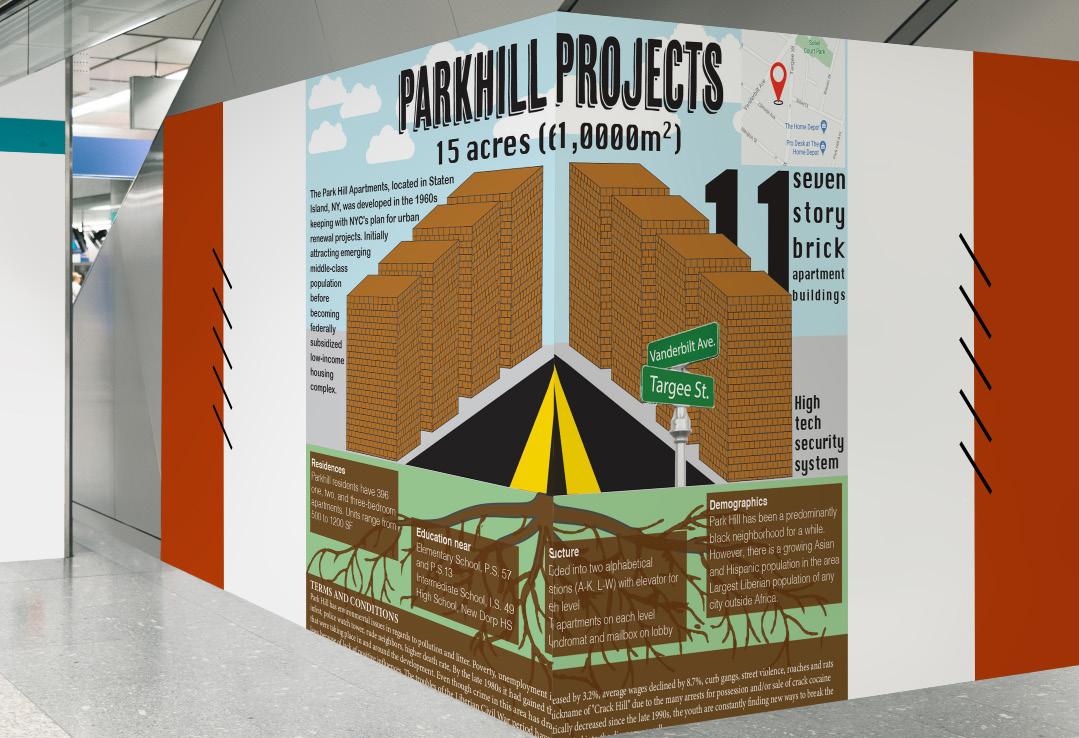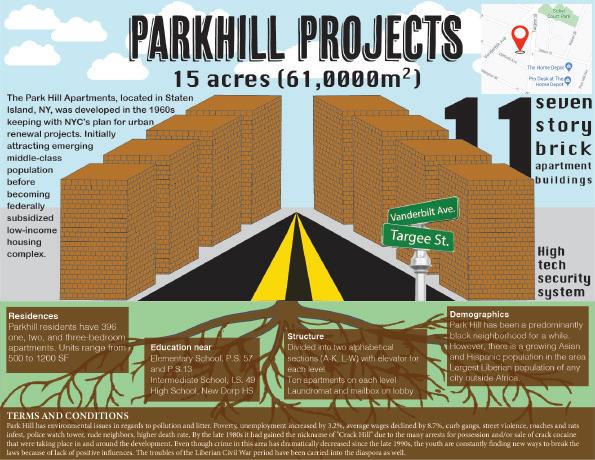 I created an informational infographic to creatively and appealingly display to viewers while informing them about a passionate topic. The architectural development of my neighborhood, Parkhill apartments, on the North Shore of Staten Island, has been a prominent establishment in New York City’s plan for urban renewal projects.