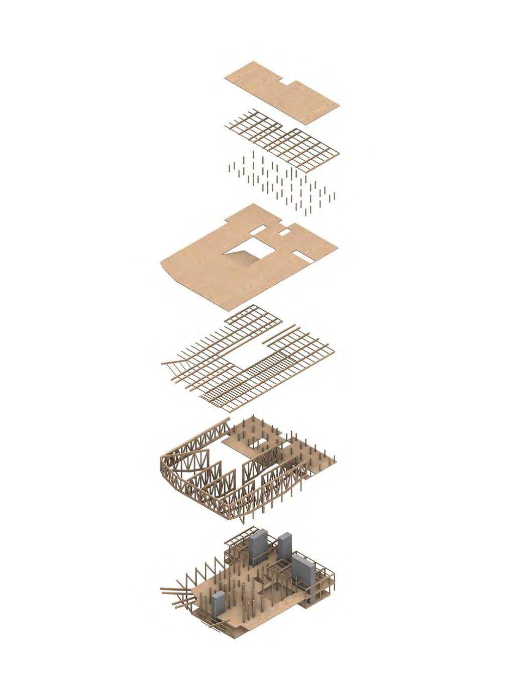 My building uses a combination of CLT and Glulam as well as structural concrete for vertical circu lation. The columns are spaced on a 6m grid with some 3m aisles. The result is a skeletal shell that is visi ble on the inside and outside of the building. Mass timber is a sustainable building method and can be lo cally sourced. The cantilever theaters are framed with repeating trusses along the south facade and are designed carefully such that the truss’s members all intersect through their centroids at their respective pins. The joists running perpendicularly carry the roof load to the trusses allowing for larger spans within the theaters. The structural strategy of this project encompasses everything I have learned from my Archi tectural Technology courses until now. The “big move“ of my project is the exposed structure both out side and in. Inside the theaters, visitors are enveloped by the truss system that allows them to cantilever. The structure has a certain elegance that can be appreciated but is not distracting while watching films.