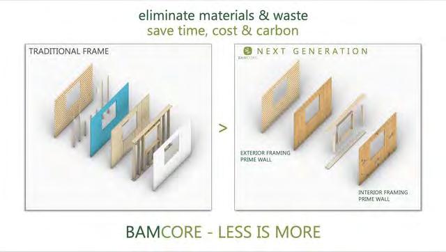 This house experiments with BAMCORE, a sustainable option for structural framing and a variation of Structurally Insulated Panels (SIPs). The walls are composed of 1.25” laminated bamboo panels, teathered together with standard timber 2x6” (actually 1.5x5.5”) planks to create a total 8” wall thickness. Along with bamboo being a fast growing and sustainable wood, these wall assemblies save on materials, cost and carbon.