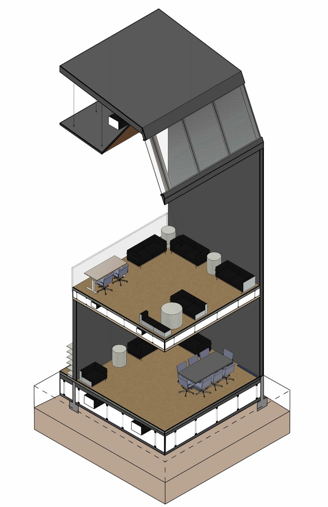 Section displaying the sawtooth roof and how I relates to the massing underneath. The roof was developed from Climate Studio studies.